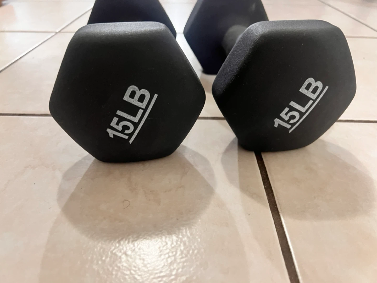 A pair of 15 LB dumbbells. These hex-shaped dumbbells have a black finish and are great for weight training at home or in the gym. They're sold as a set of two.