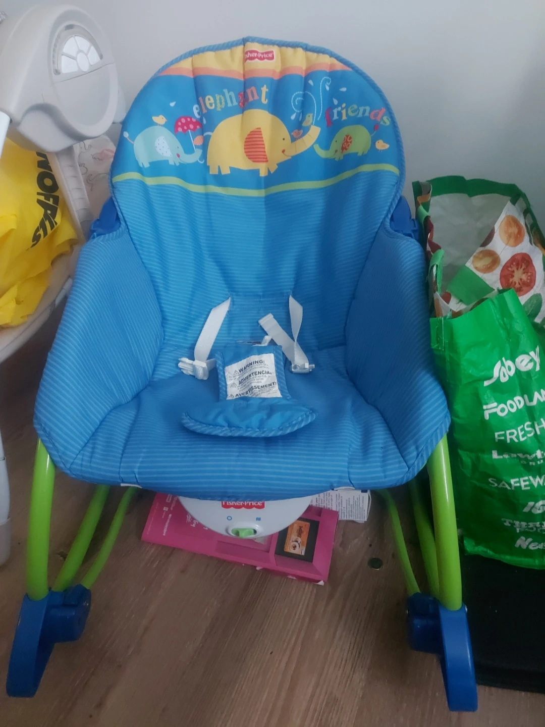 This Fisher-Price baby rocker features a blue seat with a fun elephant friends design. It has a padded seat and safety straps for your little one. The bright green legs provide a stable base for gentle rocking.