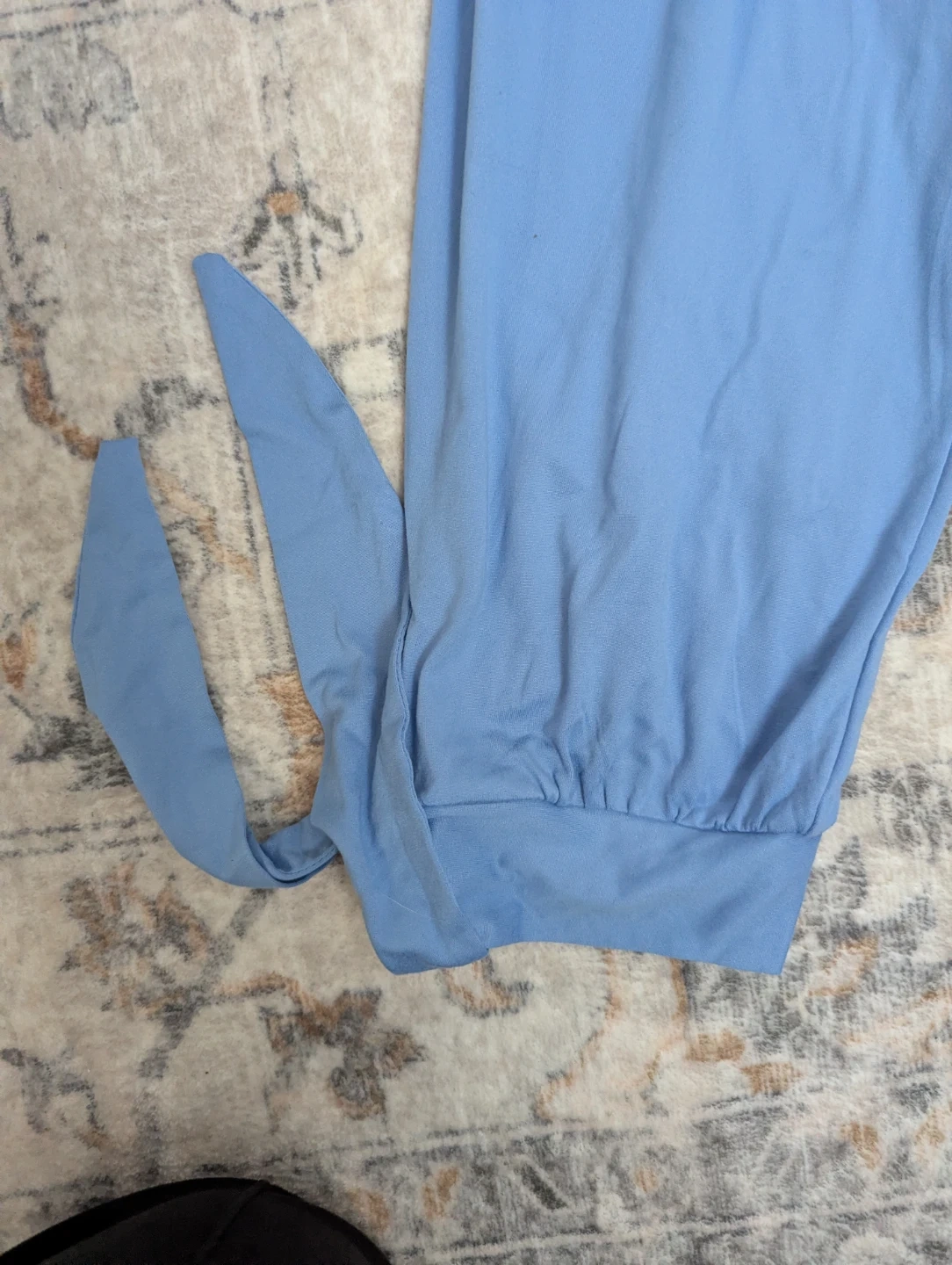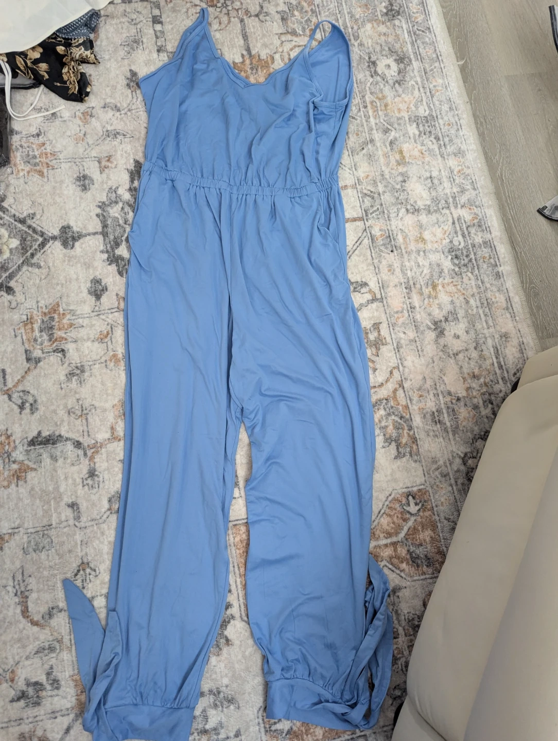 This light blue jumpsuit has adjustable spaghetti straps and a cinched waist with pockets. It's made of a soft, flowy material. The leg cuffs have tie details.