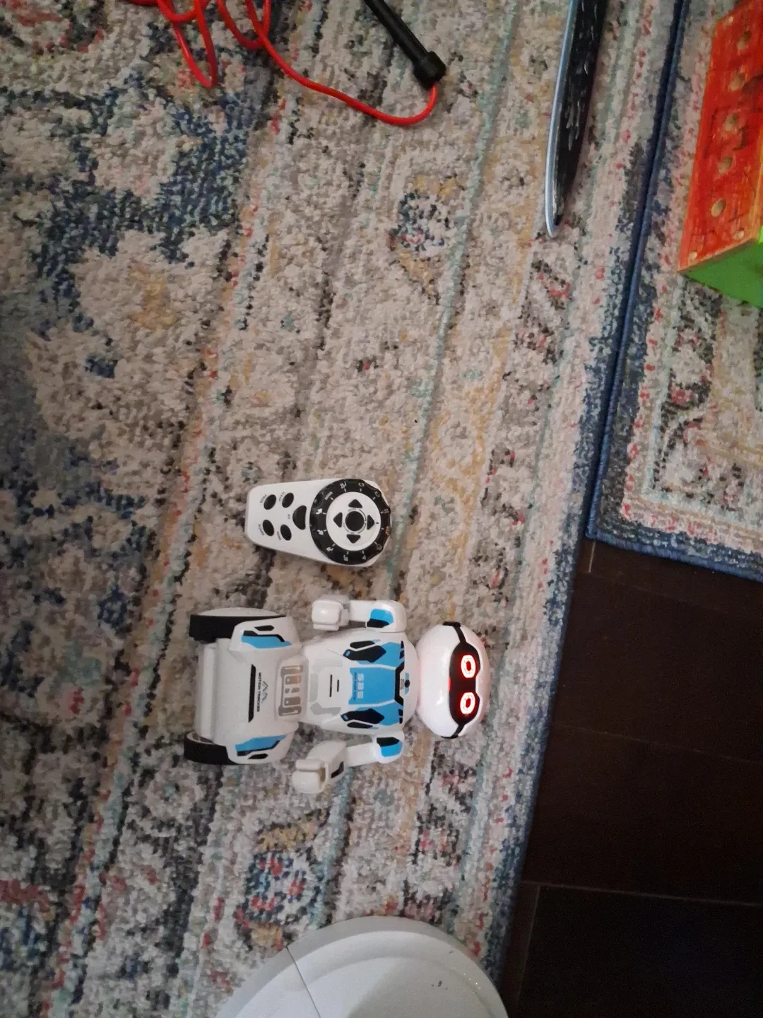 This is a fun remote control robot toy. It's white with blue accents and has LED eyes. It comes with a remote control for easy operation. This toy is great for interactive playtime!