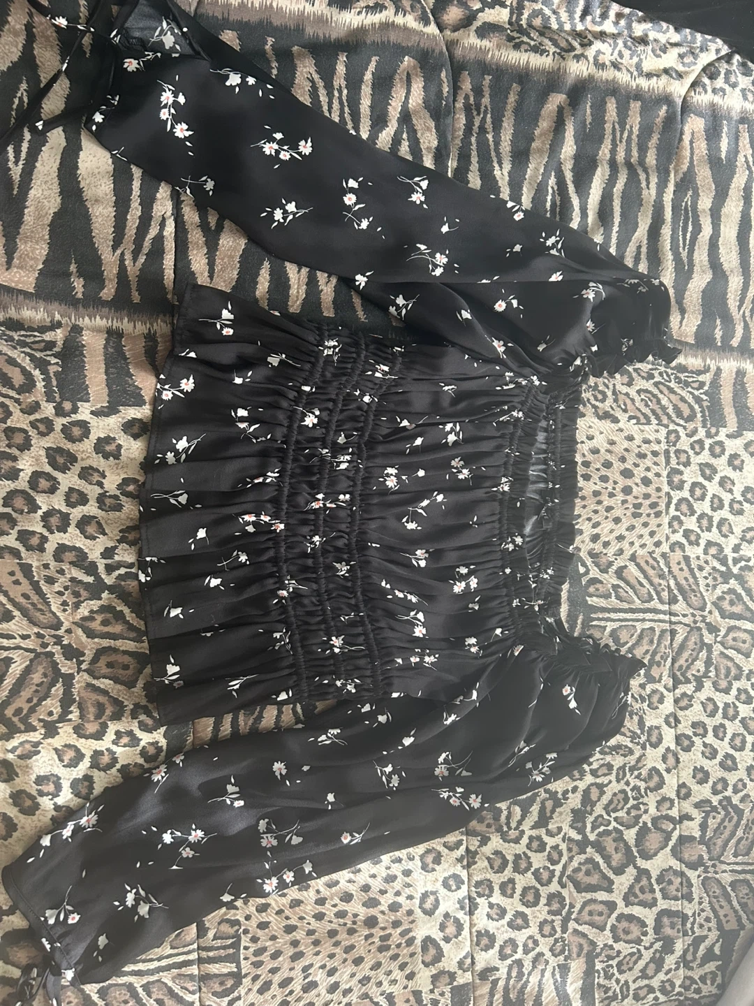 Black crop top from Dynamite with a white floral print. It features a smocked bodice and puffed sleeves. Made with lightweight fabric, it's perfect for warmer weather!
