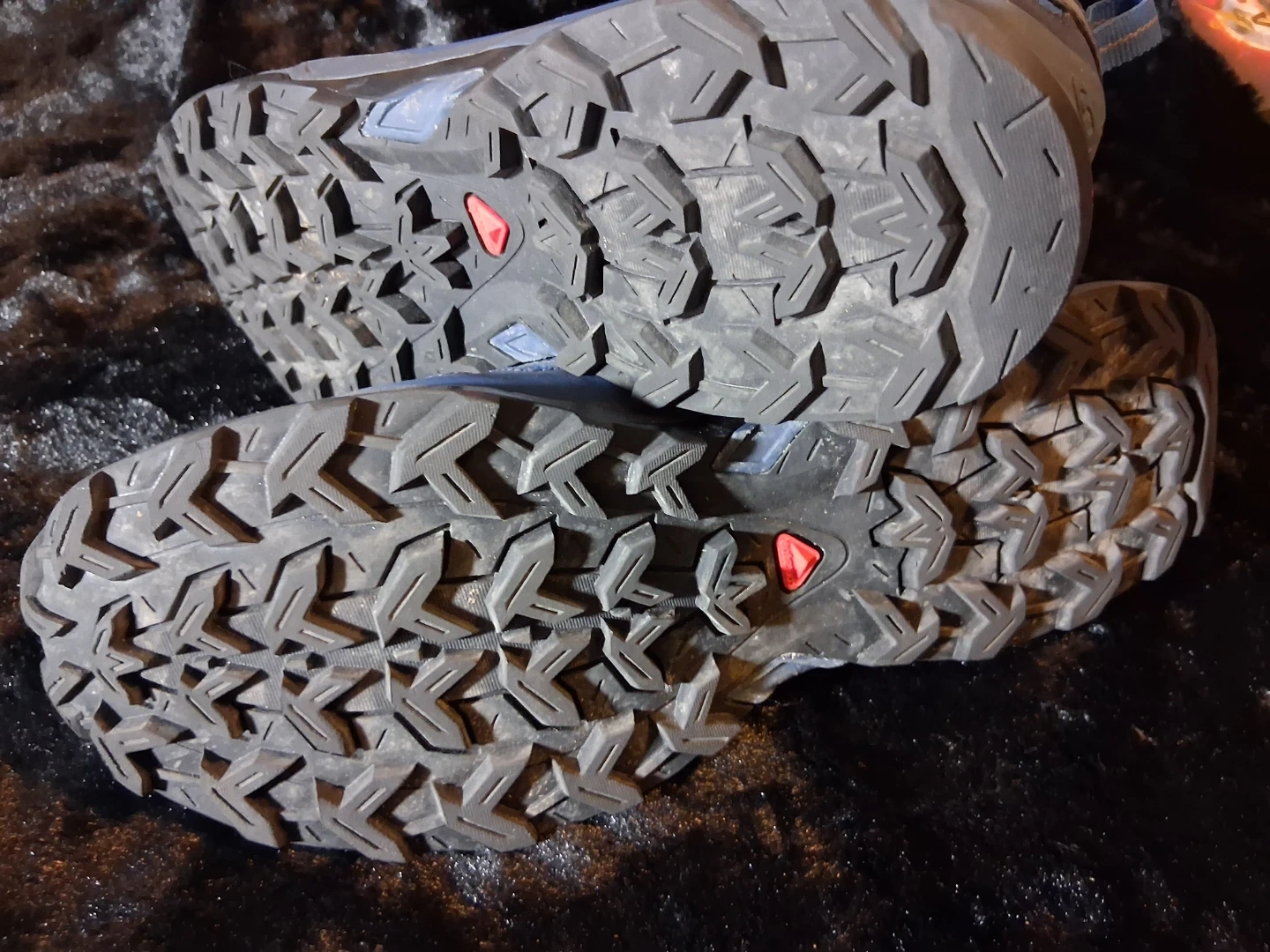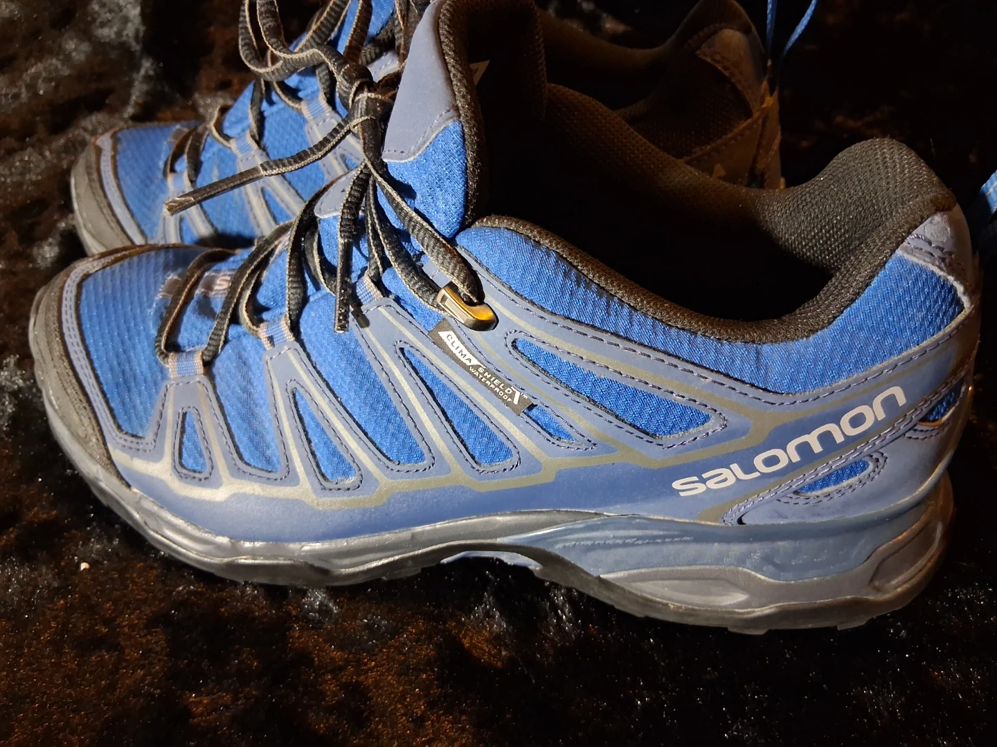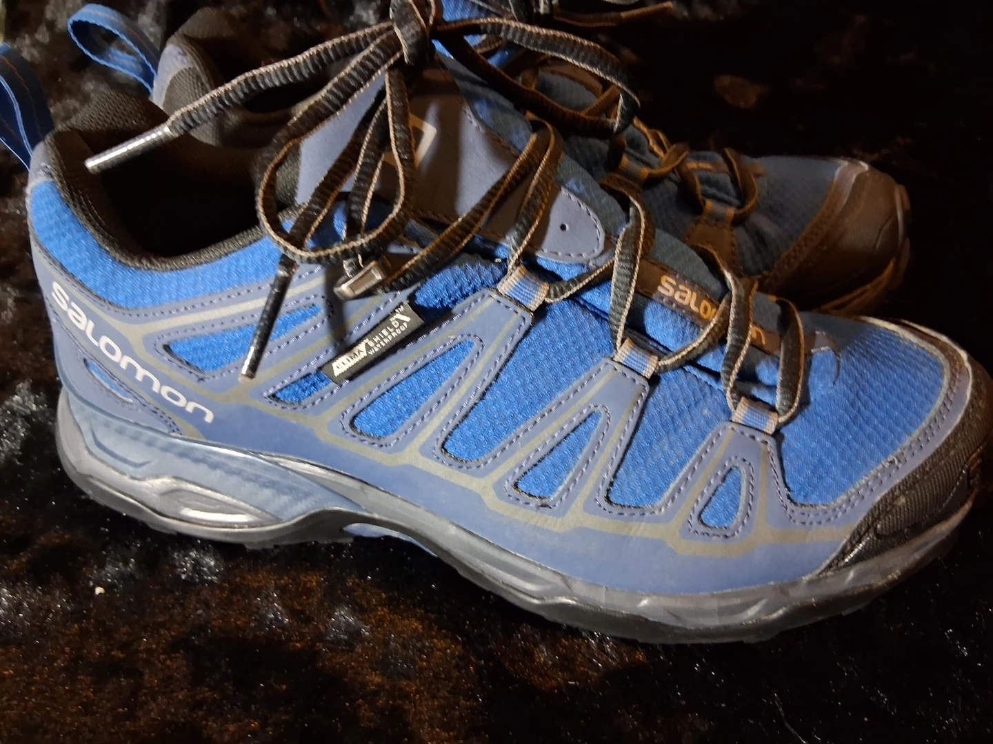 These Salomon X-Ultra hiking shoes are blue and grey. They feature a durable construction with a grippy sole. ClimaShield waterproof technology helps keep feet dry.