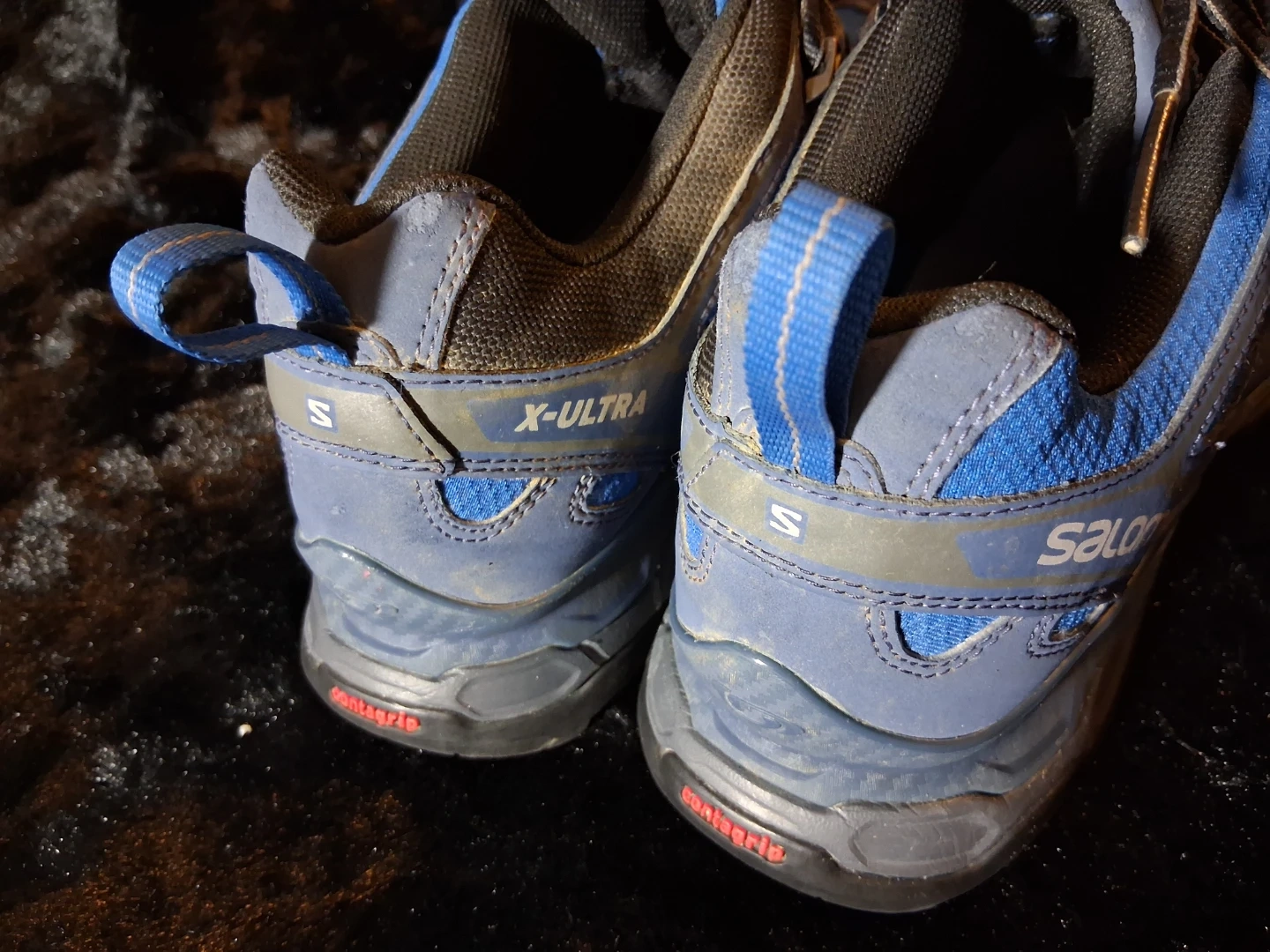 These Salomon X-Ultra hiking shoes are blue and grey. They feature a durable construction with a grippy sole. ClimaShield waterproof technology helps keep feet dry.