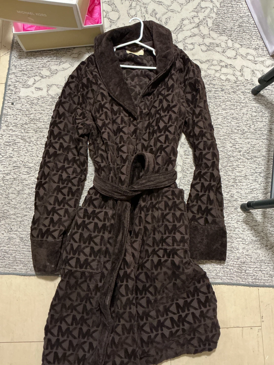 Cozy velour robe featuring the all-over Michael Kors MK pattern. It includes a matching belt and two front pockets. Perfect for lounging at home!