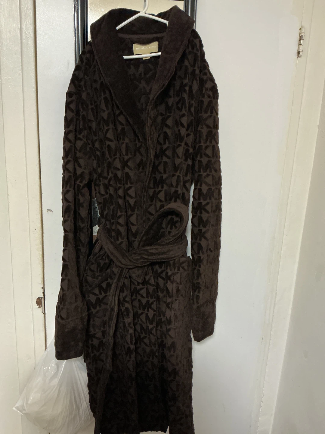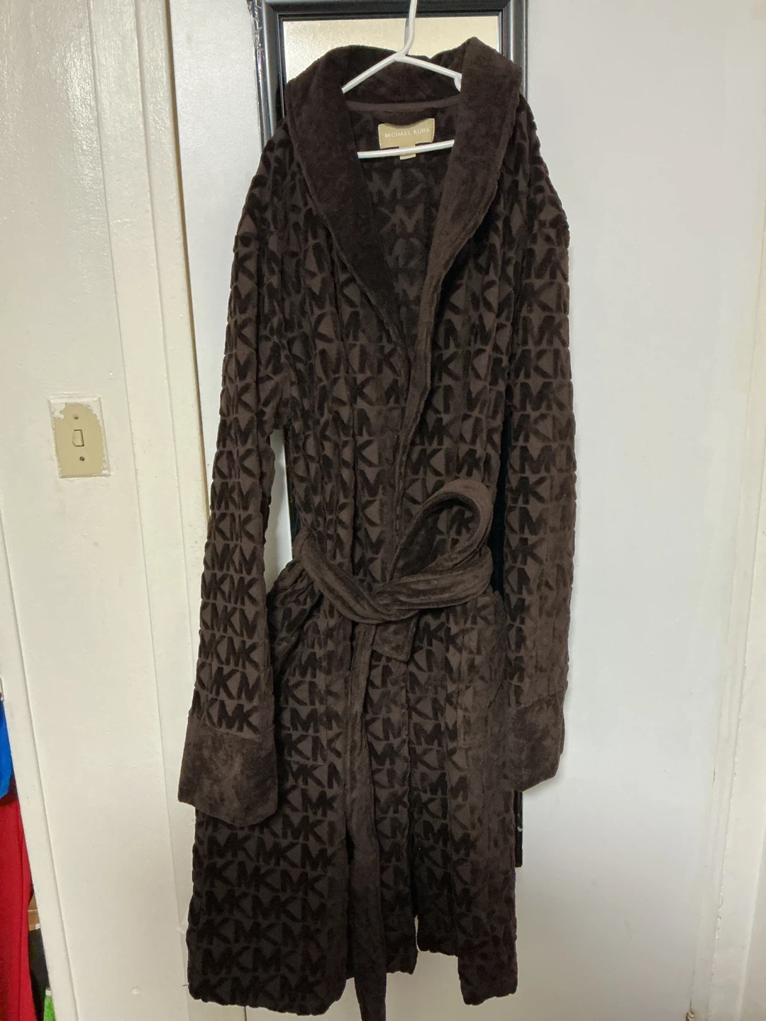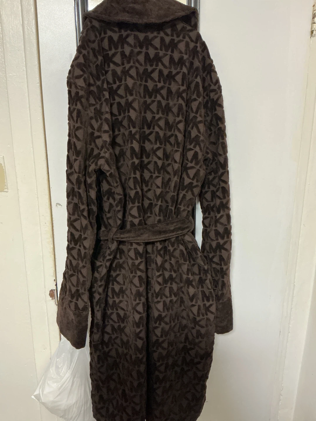 Cozy velour robe featuring the all-over Michael Kors MK pattern. It includes a matching belt and two front pockets. Perfect for lounging at home!
