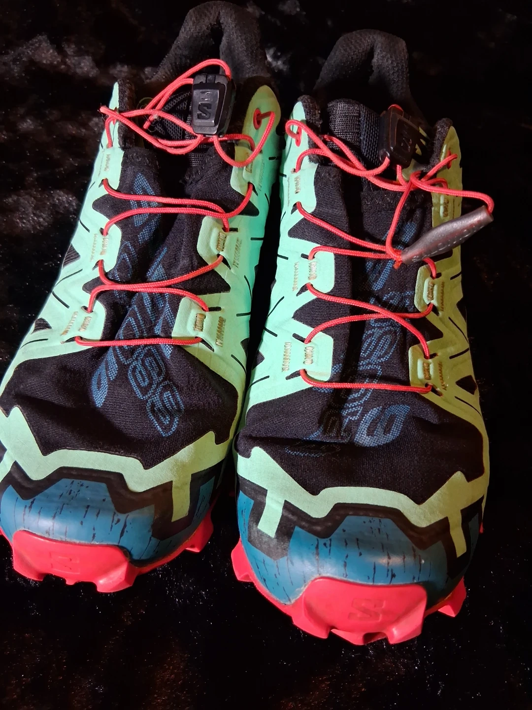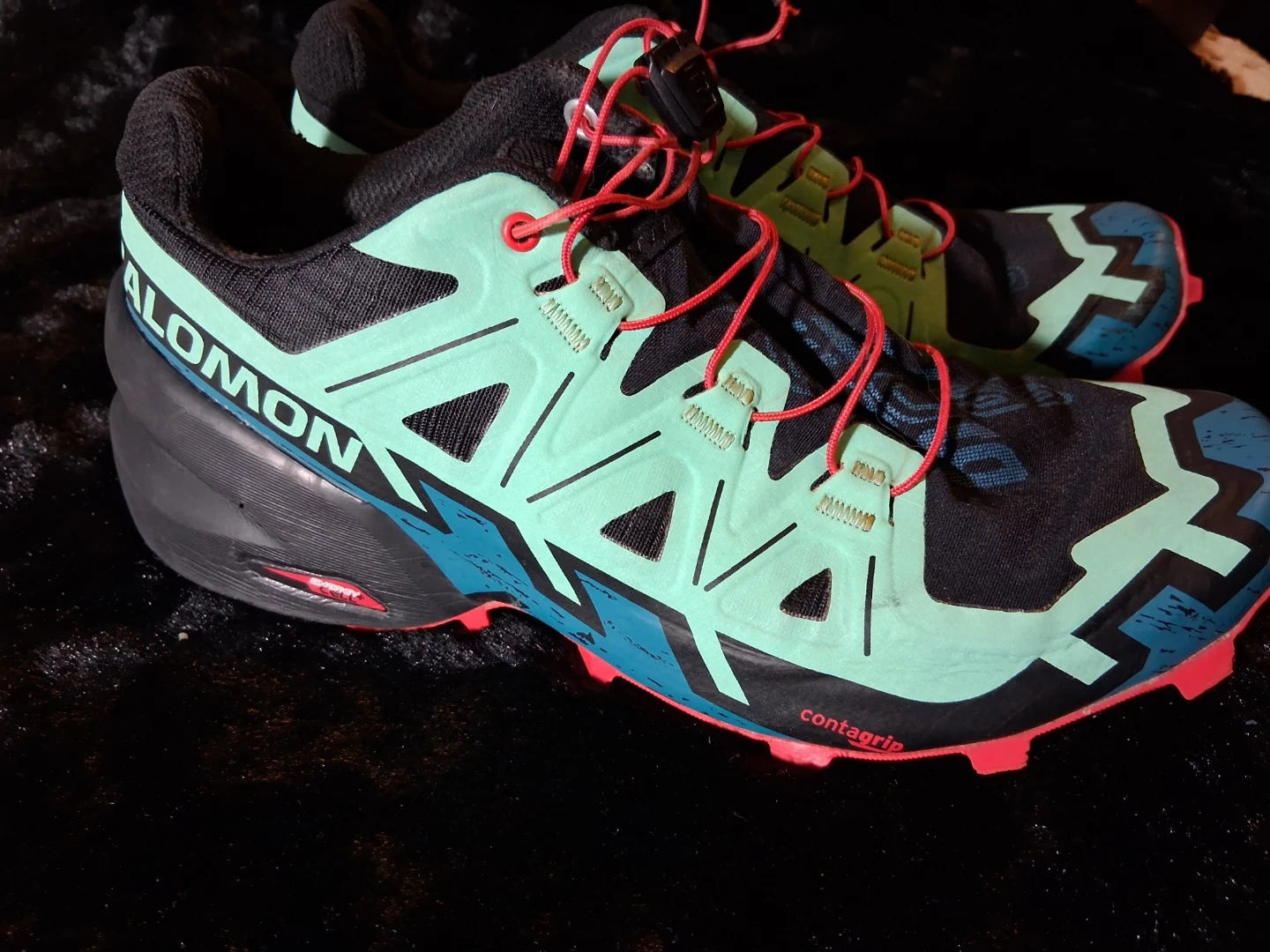 Salomon Speedcross trail running shoes. Teal, black, and pink colorway. Features Contagrip sole for enhanced traction. Ideal for rugged terrain!