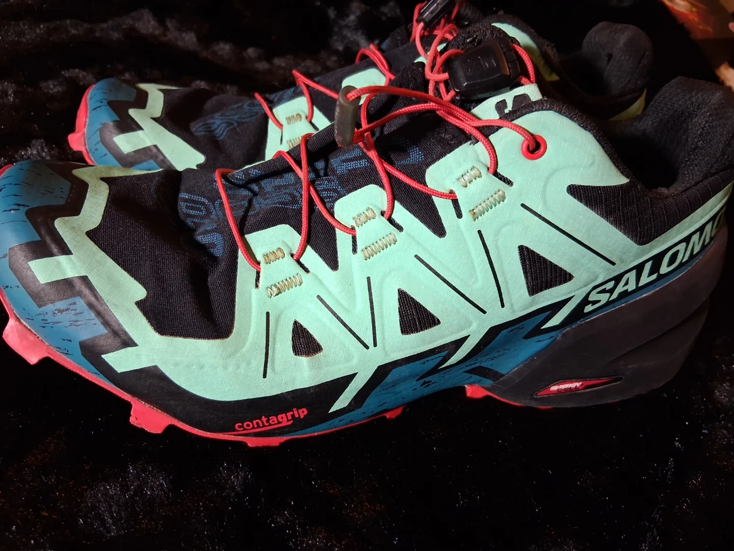 Salomon Speedcross trail running shoes. Teal, black, and pink colorway. Features Contagrip sole for enhanced traction. Ideal for rugged terrain!