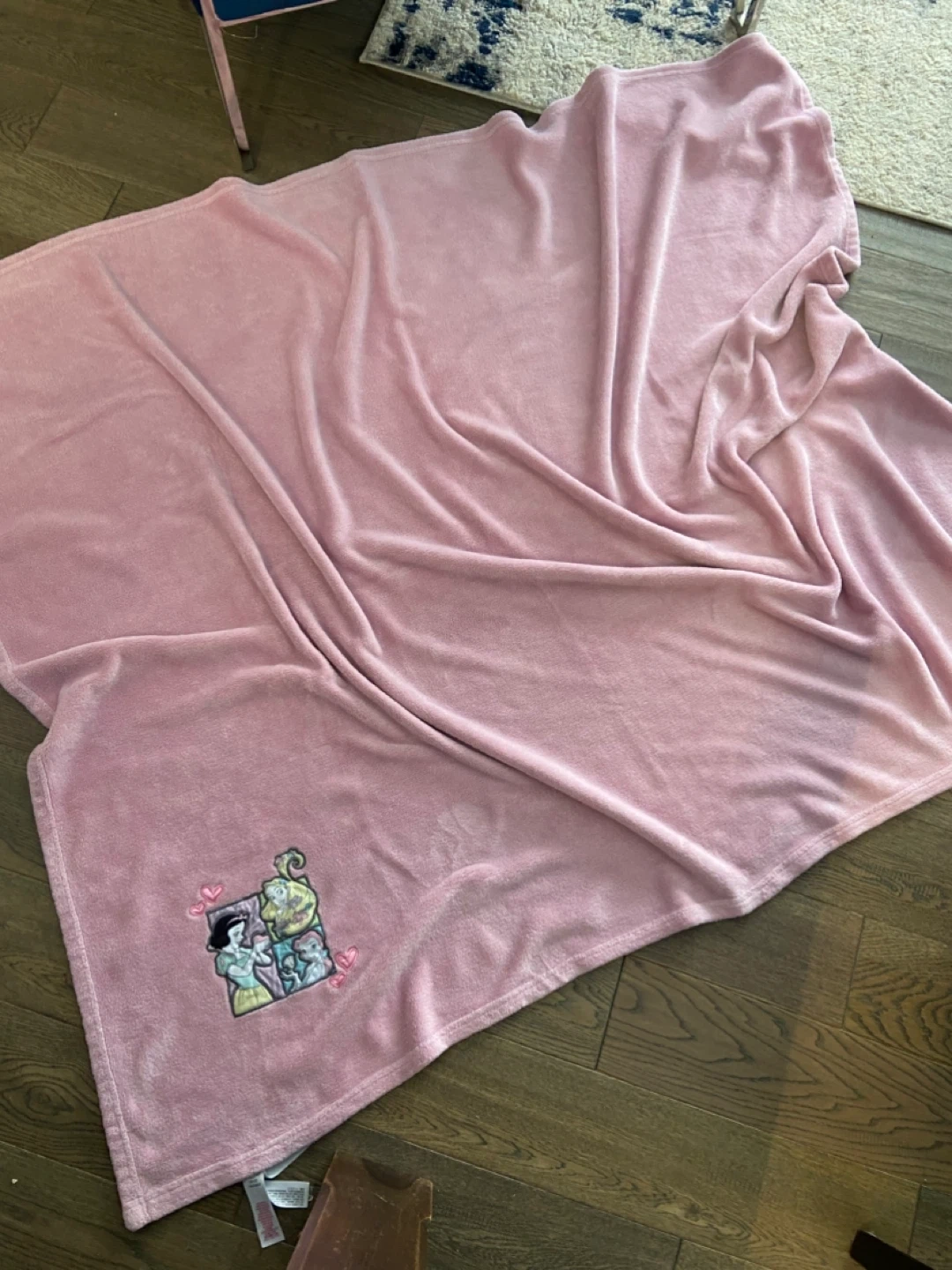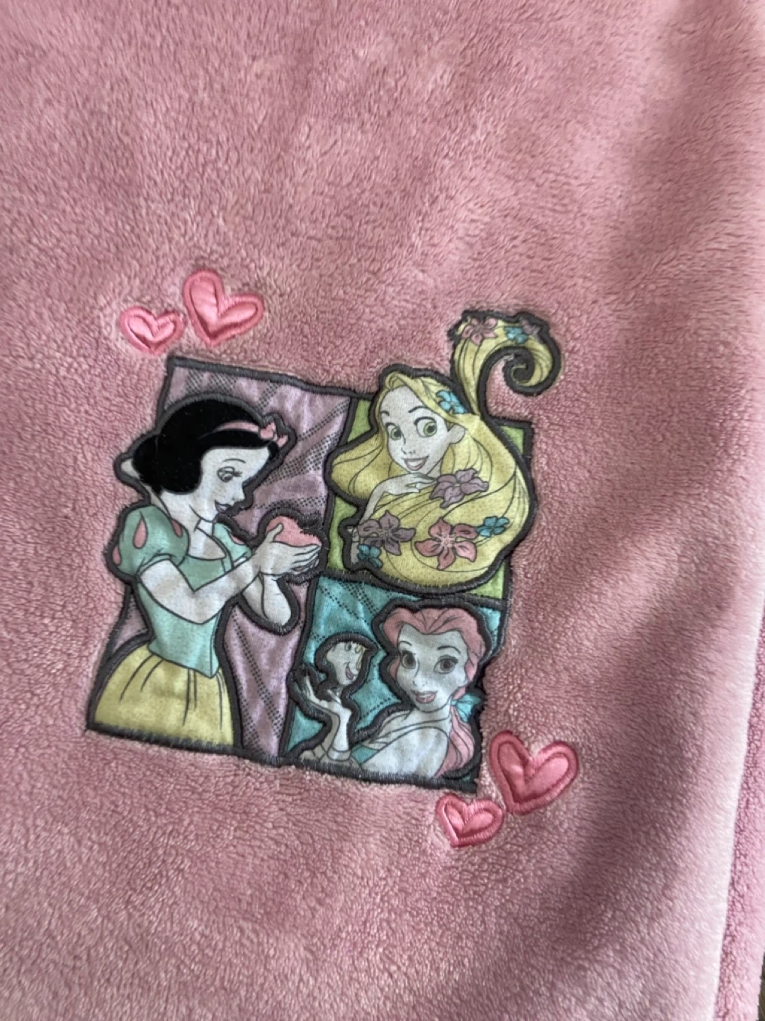 Soft pink Disney Princess fleece throw blanket featuring Snow White, Rapunzel, and Cinderella