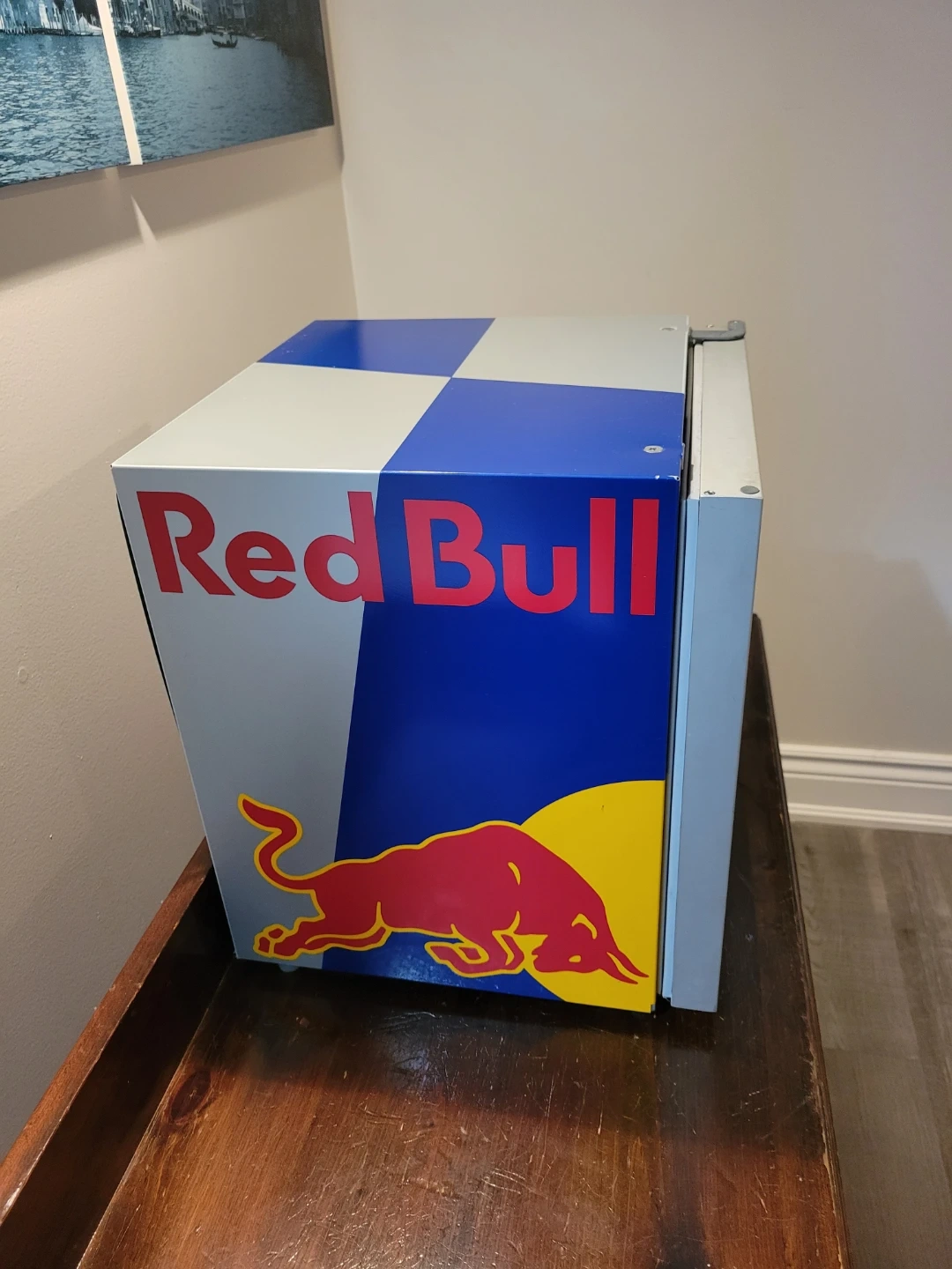 Keep your beverages ice cold with this Red Bull bar fridge! It's perfect for a home bar, office, or games room. This compact fridge is in used condition, ready to keep your drinks chilled and your space looking cool. It's a real conversation starter and a must-have for any Red Bull enthusiast.