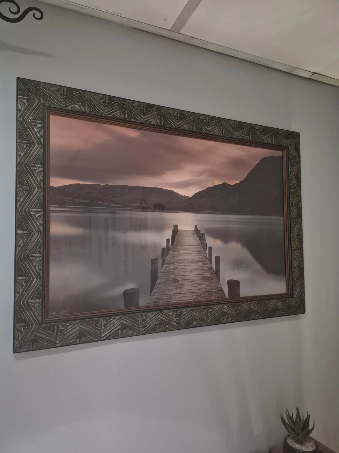 Framed landscape art featuring a wooden pier leading into a calm lake. The frame has a textured, geometric pattern. This piece adds a serene touch to any room's decor.
