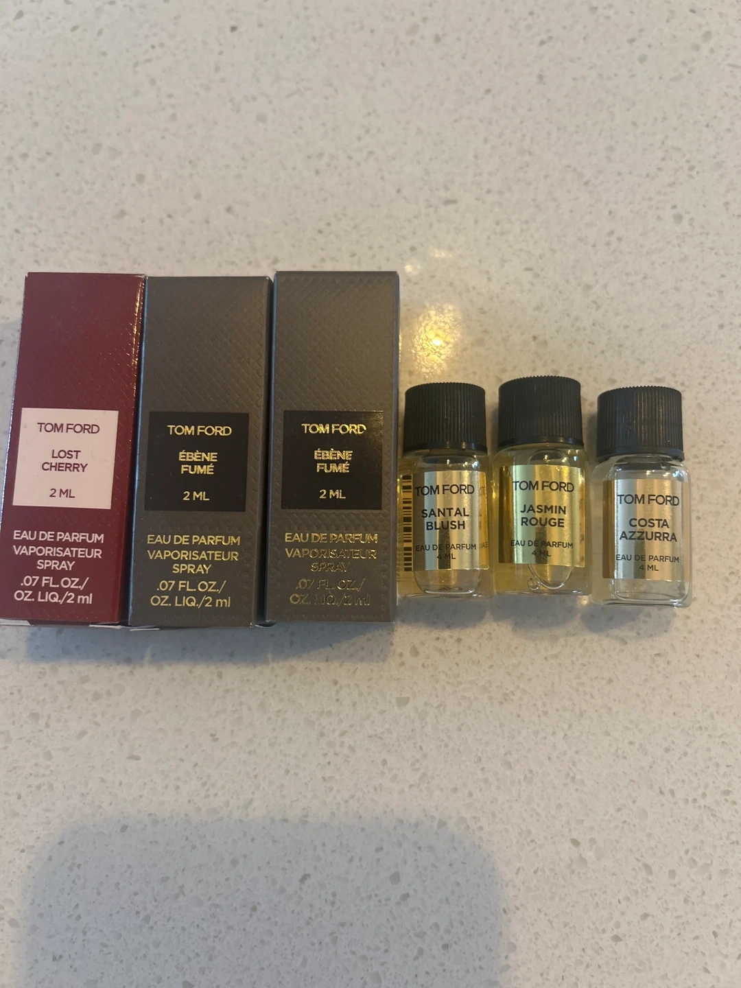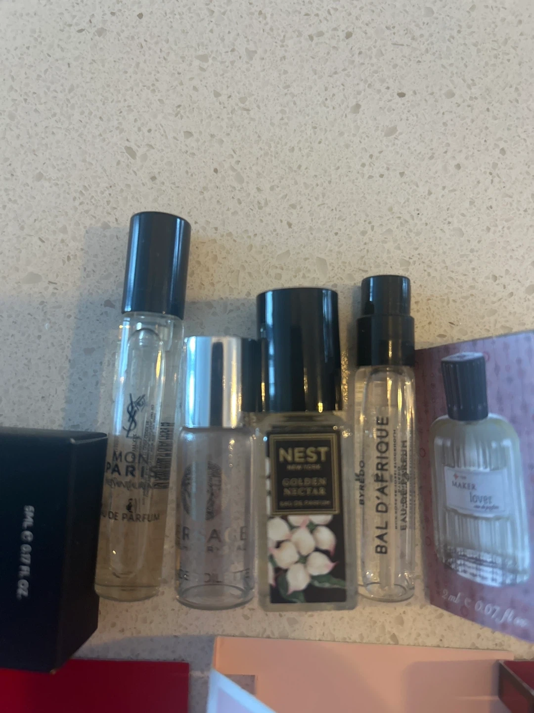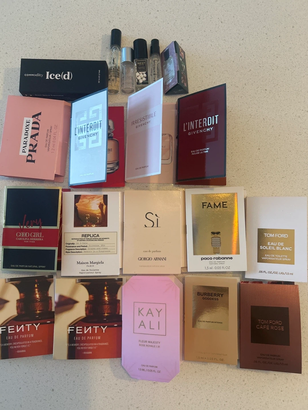 A collection of various perfume samples and miniatures. Includes brands like Givenchy, Prada, Fenty, Nest, and more. Great for trying out new scents or for travel!