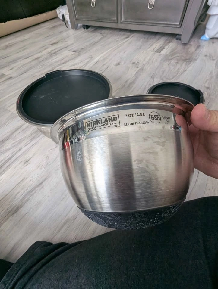 Set of 3 stainless steel bowls with tight-fitting BPA-free lids. Sizes include 7qt, 3qt, and 1.5qt. Features etched measurements and non-slip silicone bases. Bowls are dishwasher safe. Pickup in Kitchener, Forest Heights.