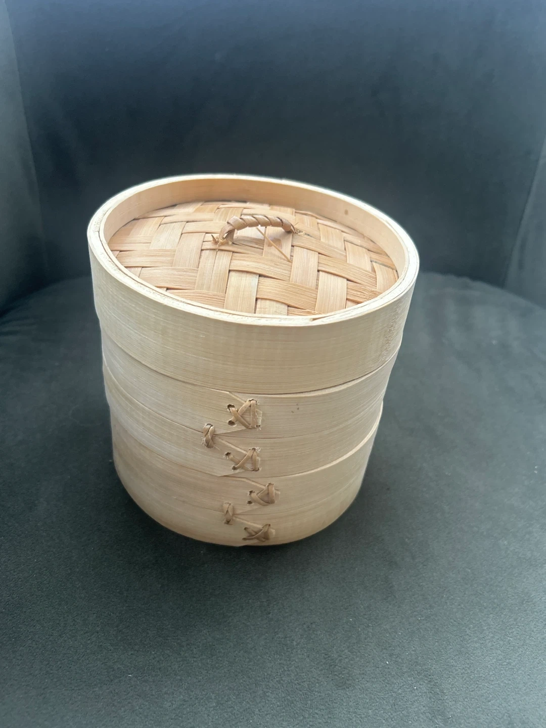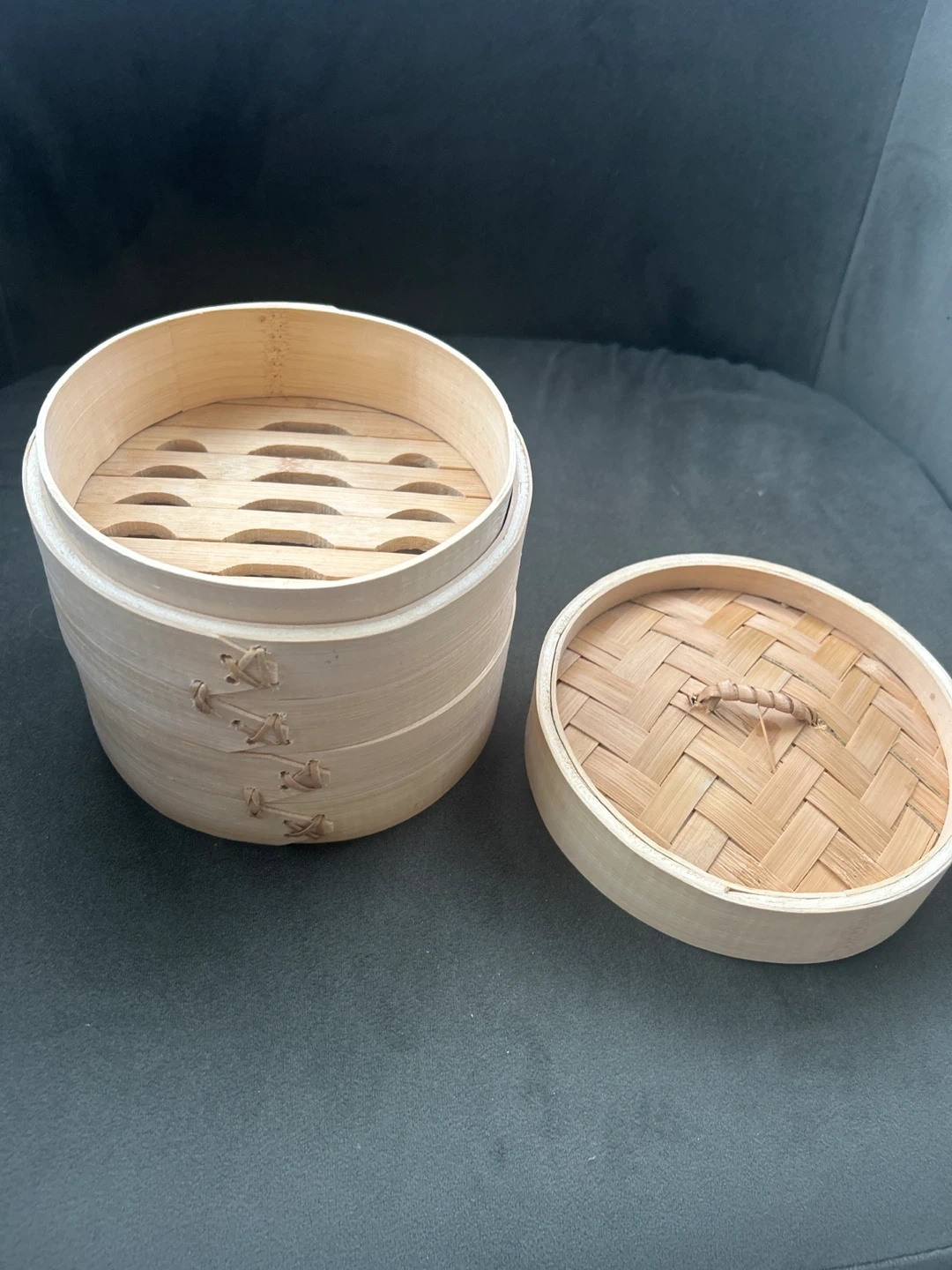 This is a bamboo steamer basket set. It's made of natural bamboo. Includes two tiers and a lid. Great for steaming dumplings or vegetables!