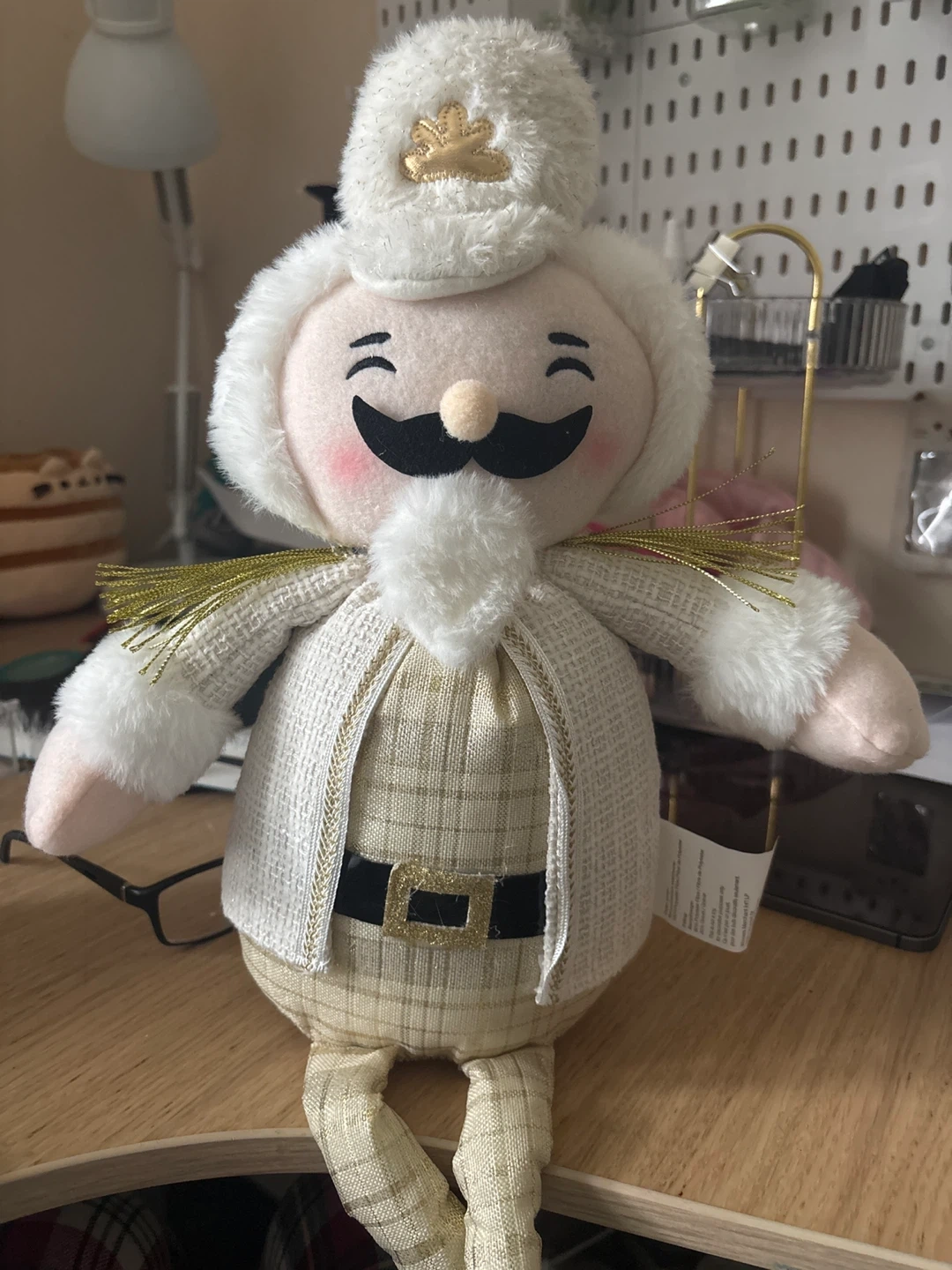 This charming decorative nutcracker figurine is ready to add some festive flair to your home this holiday season. It features a distinguished gentleman design with a white fuzzy trim and a golden crown detail. The outfit includes a textured coat, a black belt with a gold buckle, and sparkly gold-accented pants.
