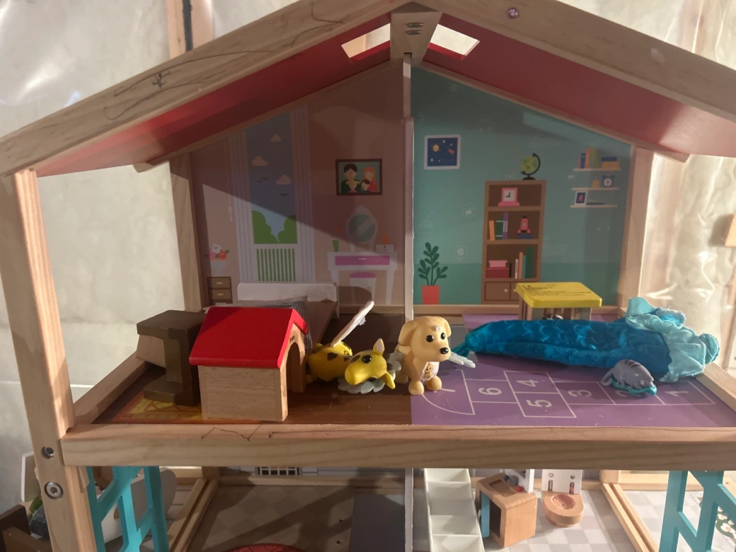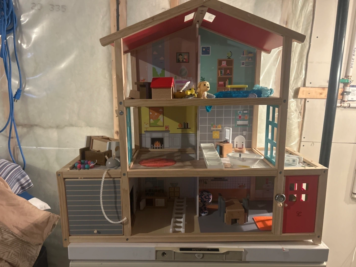 This is a wooden Hape dollhouse with multiple rooms and included accessories like furniture and figures. It features detailed interior designs and a functional garage. Hours of imaginative play await!
