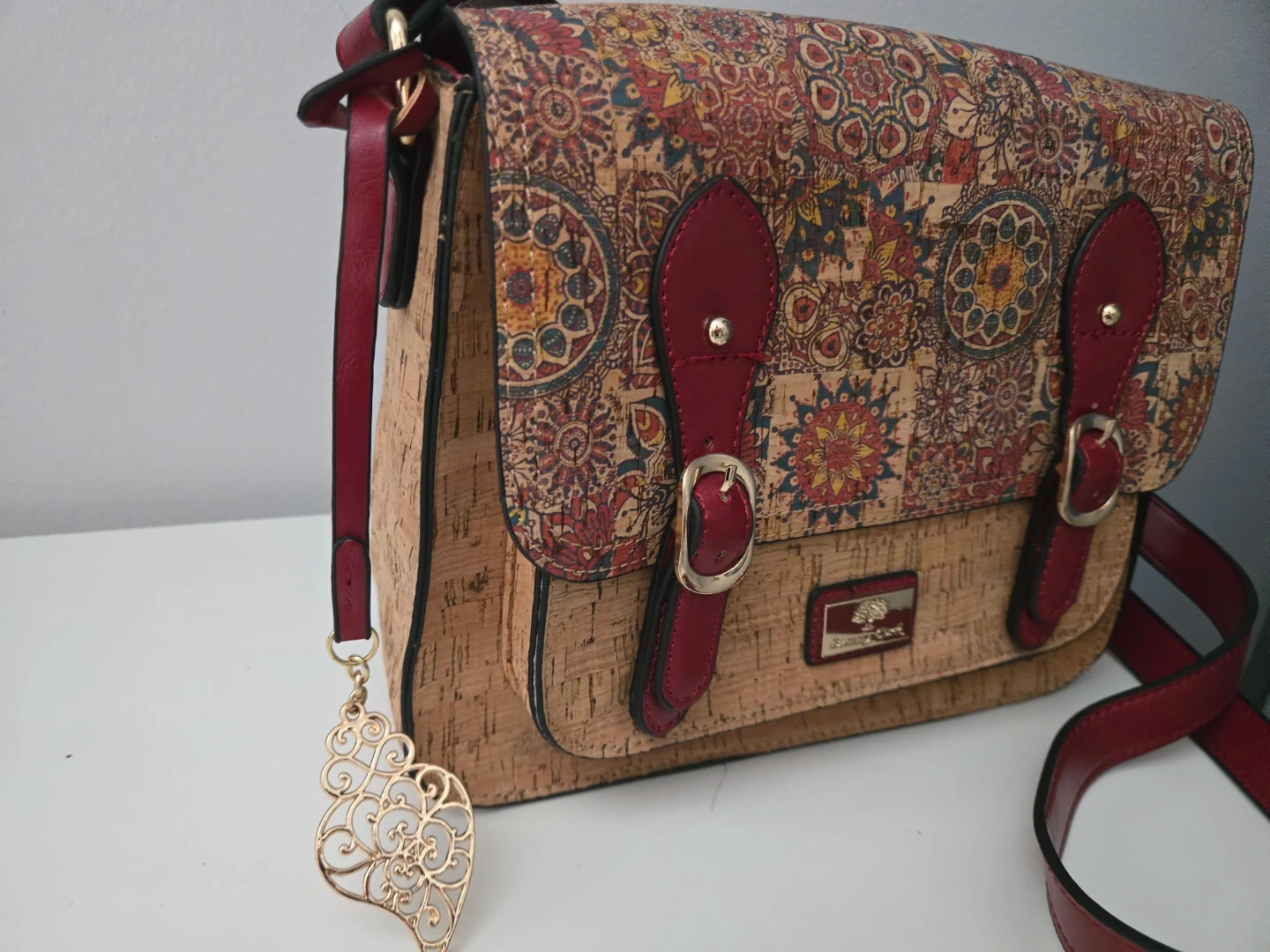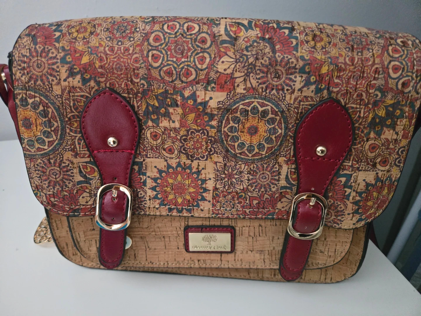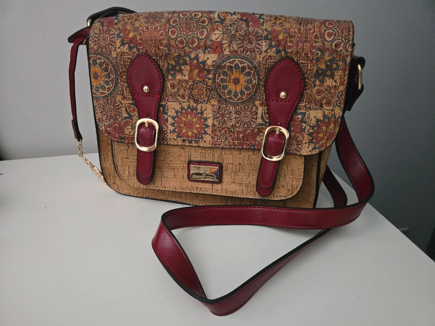 This satchel bag features a unique cork exterior from Portugal. It has a faux leather trim and strap in a deep red. The interior has multiple compartments, including a zippered pocket.