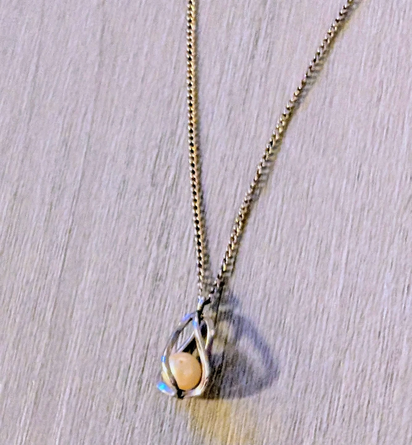 A delicate silver tone necklace featuring a pendant with a small pearl accent. It's simple and elegant, perfect for everyday wear or dressing up an outfit. This piece would make a nice gift for someone special.