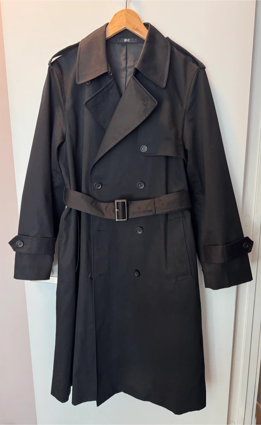Selling this gently used Uniqlo trench coat in black and size L. It's made of 100% cotton with a 100% polyester lining. It's a classic double-breasted design with a belt. Originally bought it for $149.90 + tax.