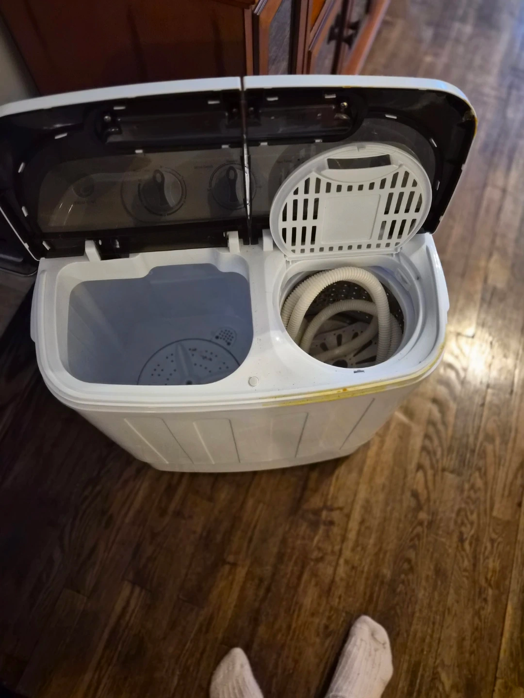 This is a portable twin tub washing machine. It has a wash timer and a spin timer. Includes a drain hose. Great for small loads!