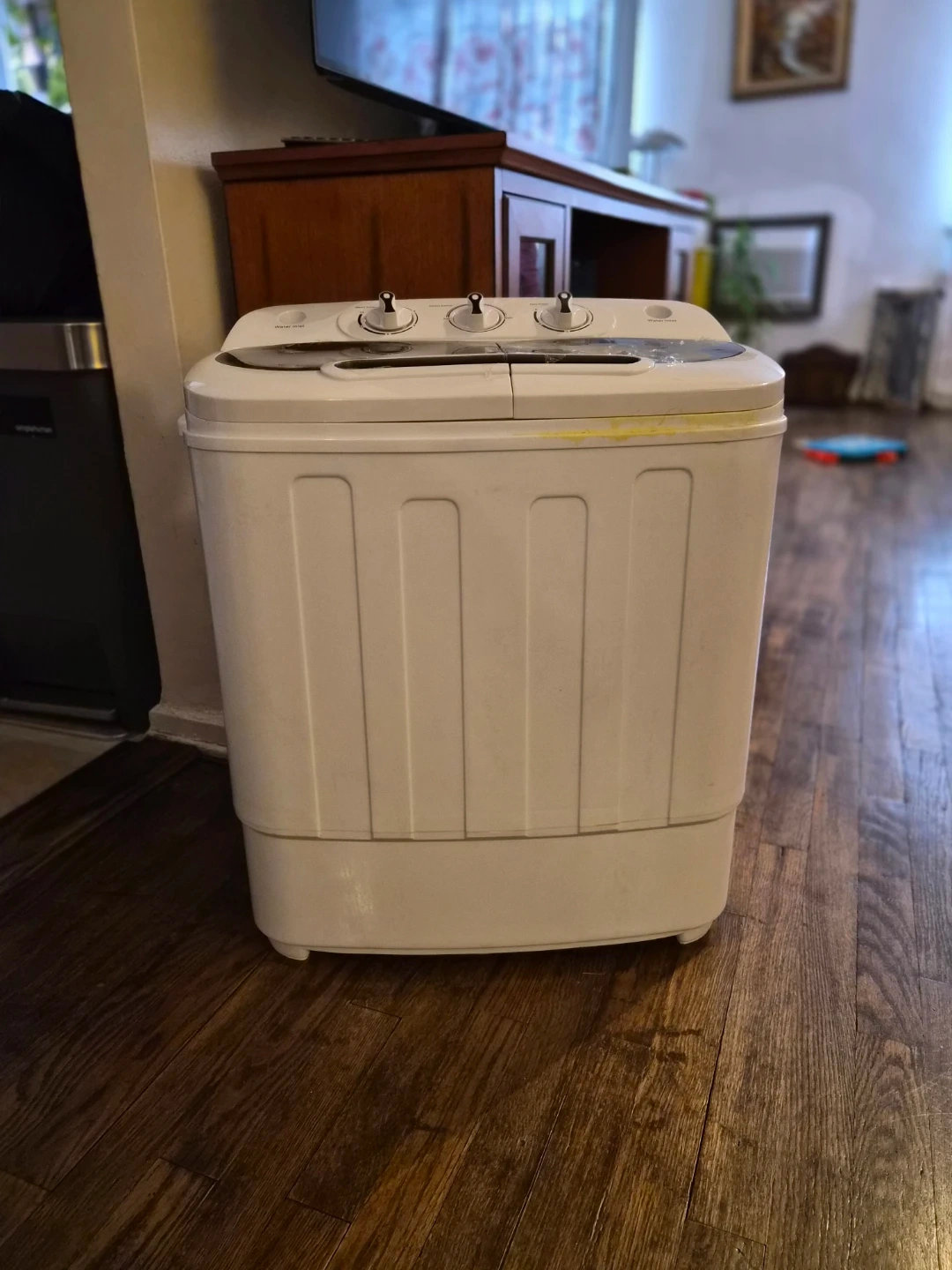 This is a portable twin tub washing machine. It has a wash timer and a spin timer. Includes a drain hose. Great for small loads!