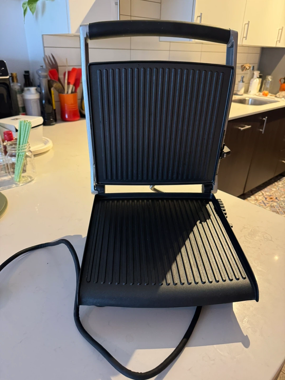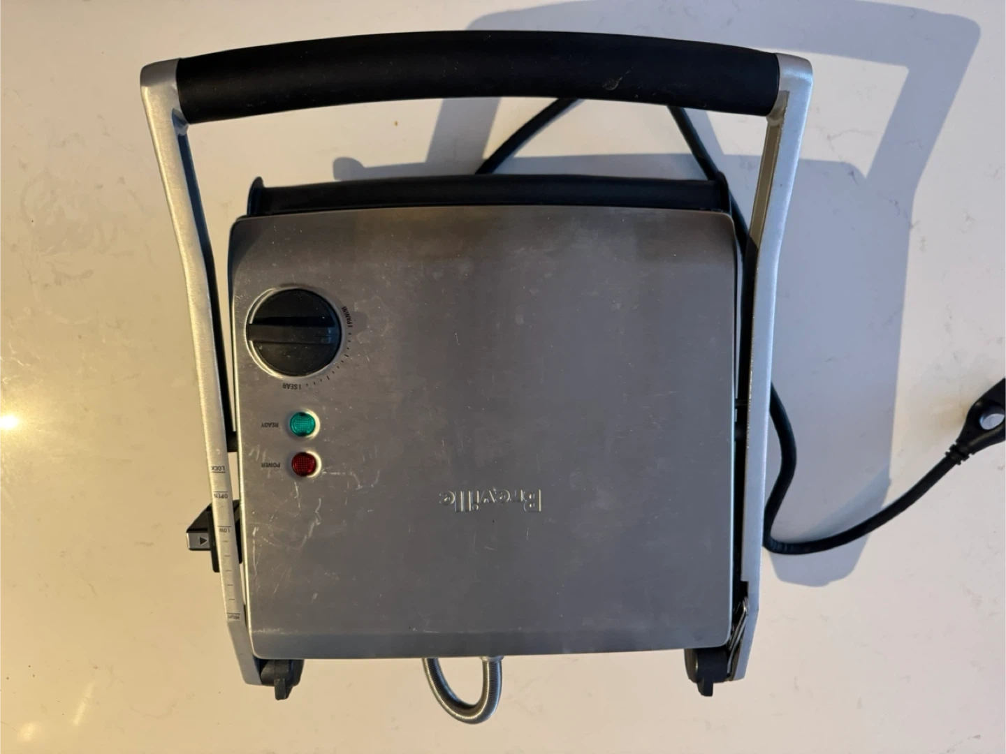 This Breville panini press grill makes quick work of sandwiches and more. It features non-stick ribbed plates for easy cleanup. Perfect for grilling up breakfast or lunch quickly!