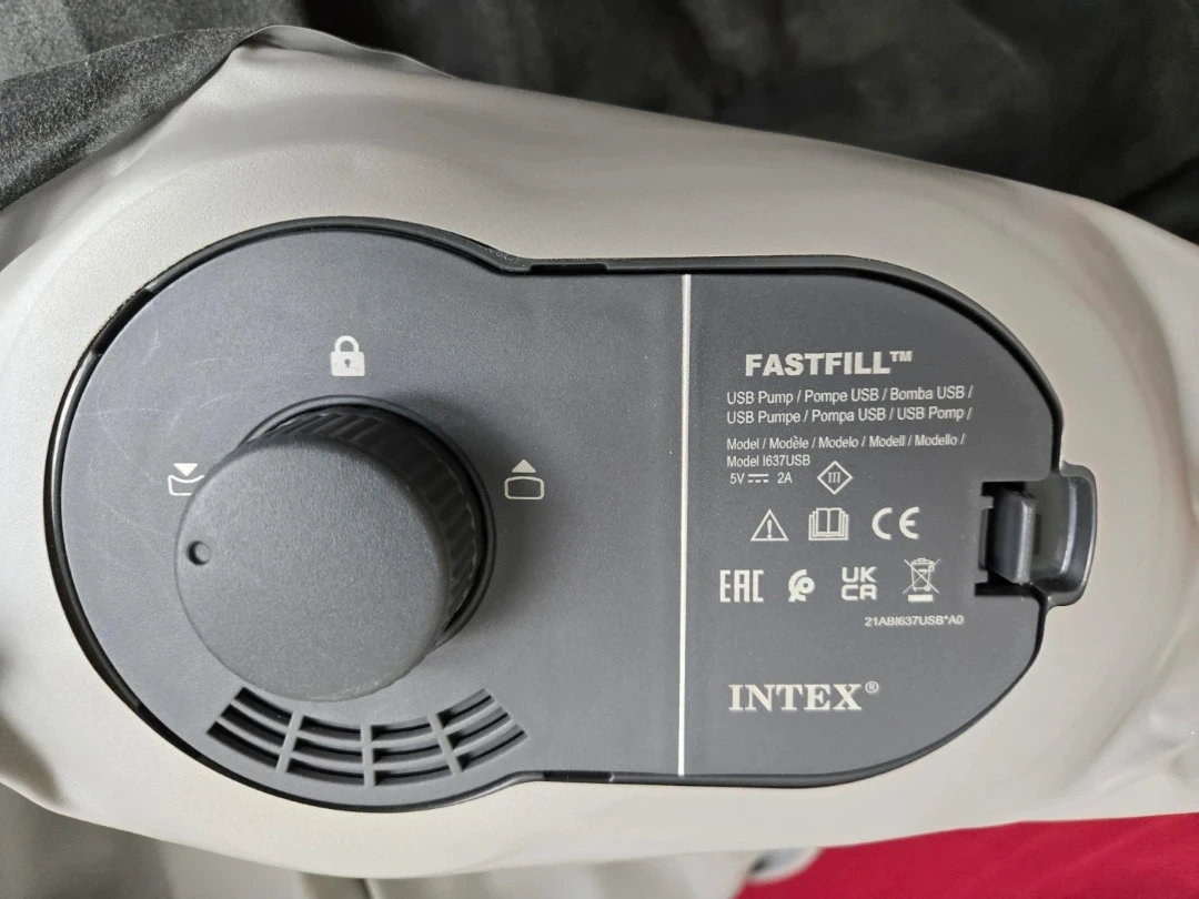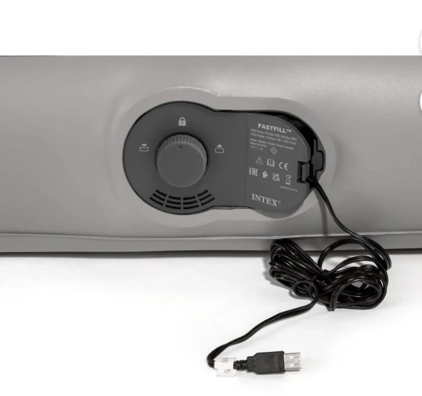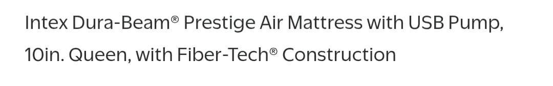 This Intex Dura-Beam Prestige air mattress is queen-sized and 10 inches thick. It features Fiber-Tech Construction and includes a built-in USB pump for convenient inflation and deflation.