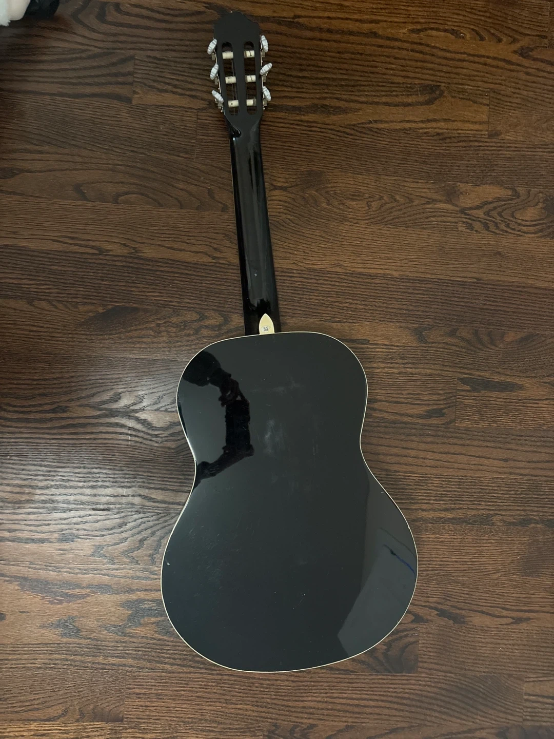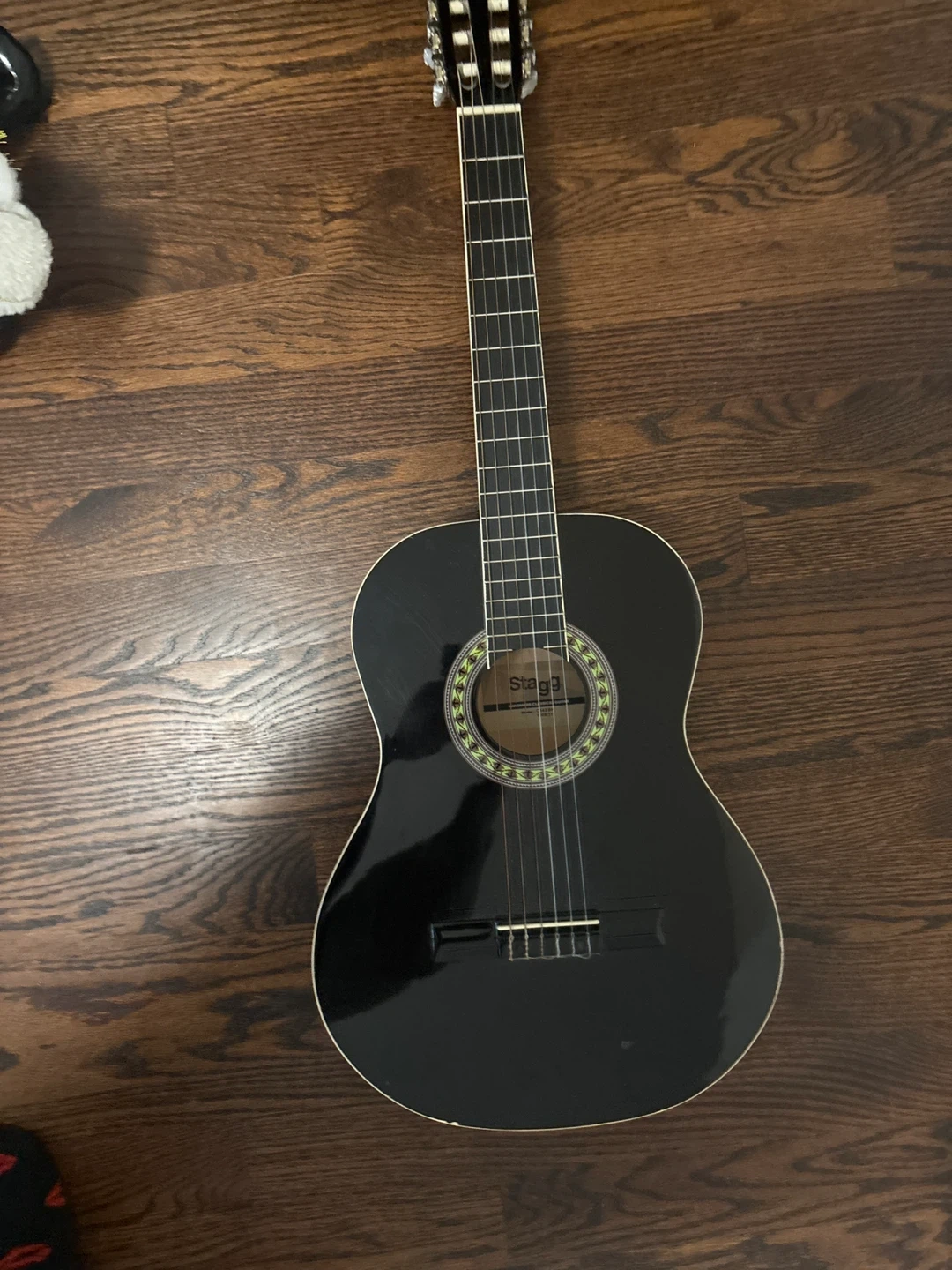 This is a black Stagg classical guitar. It's in good condition and ready for its next player. Great for beginners learning to play! Comes with black case.