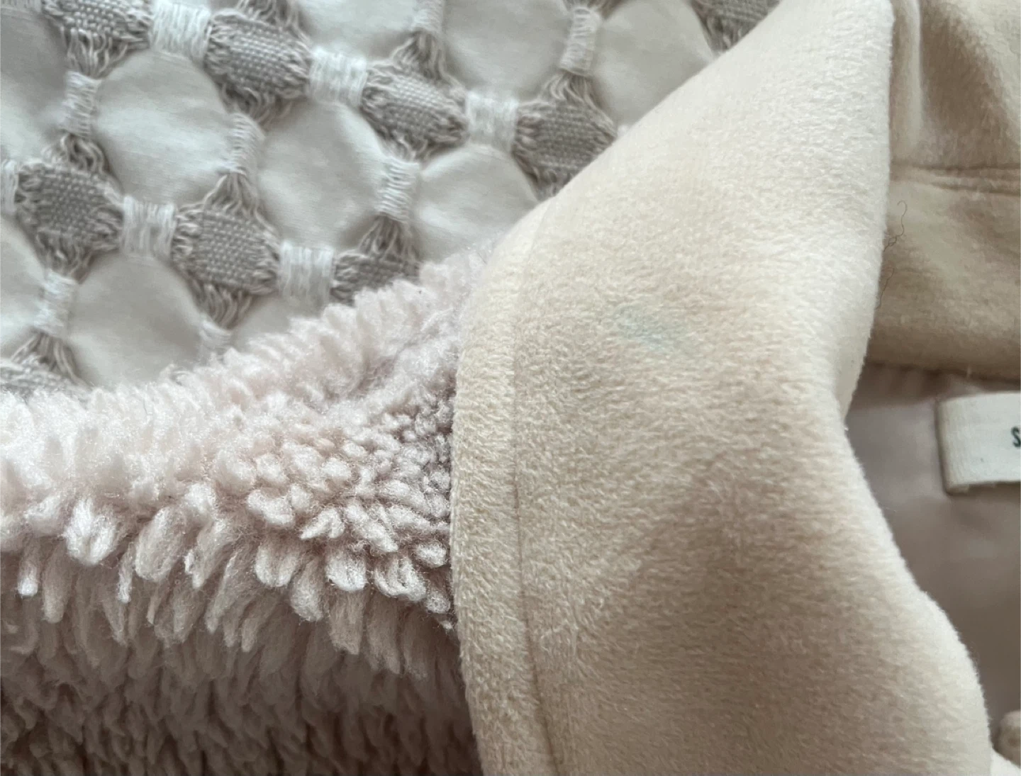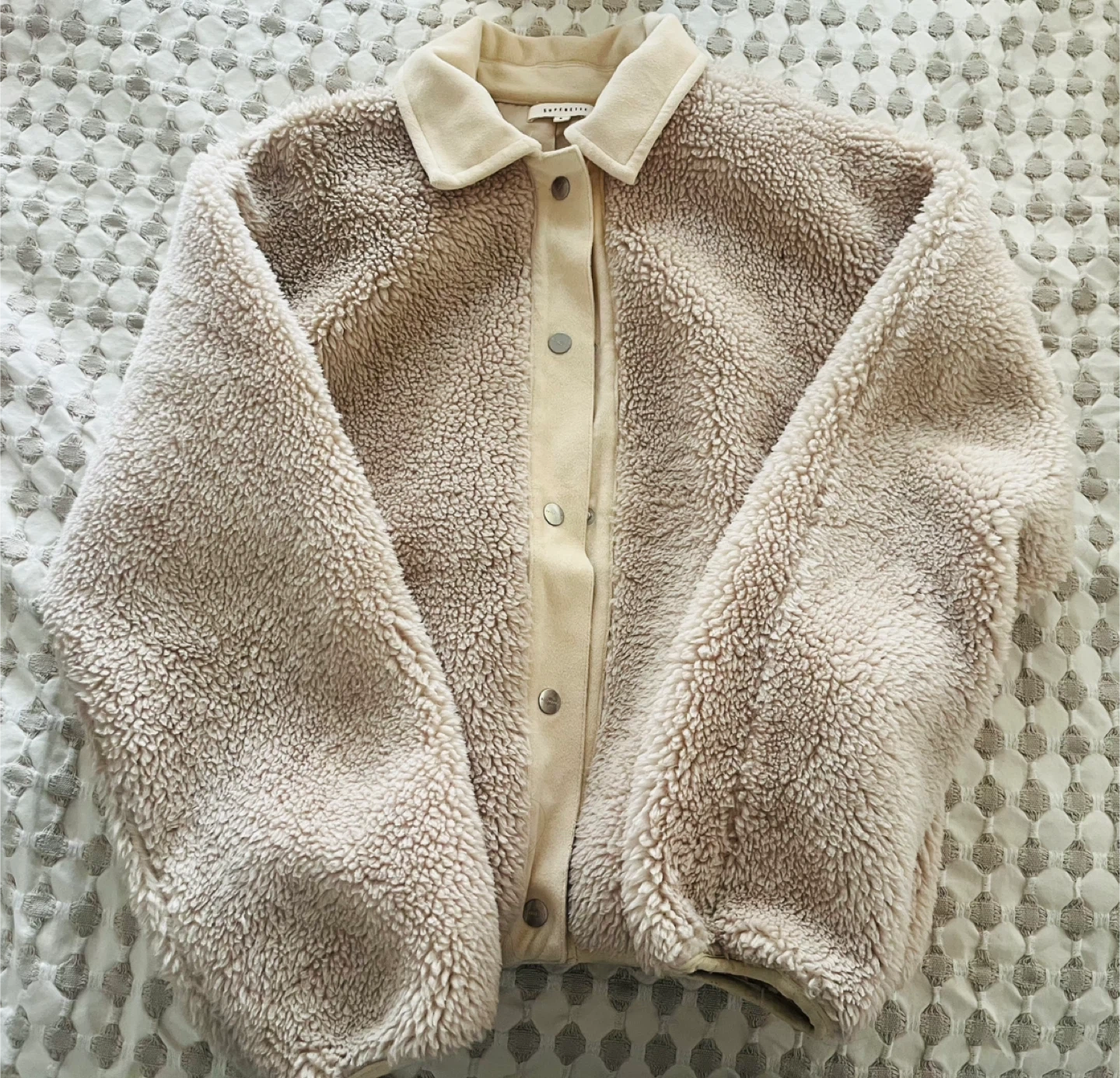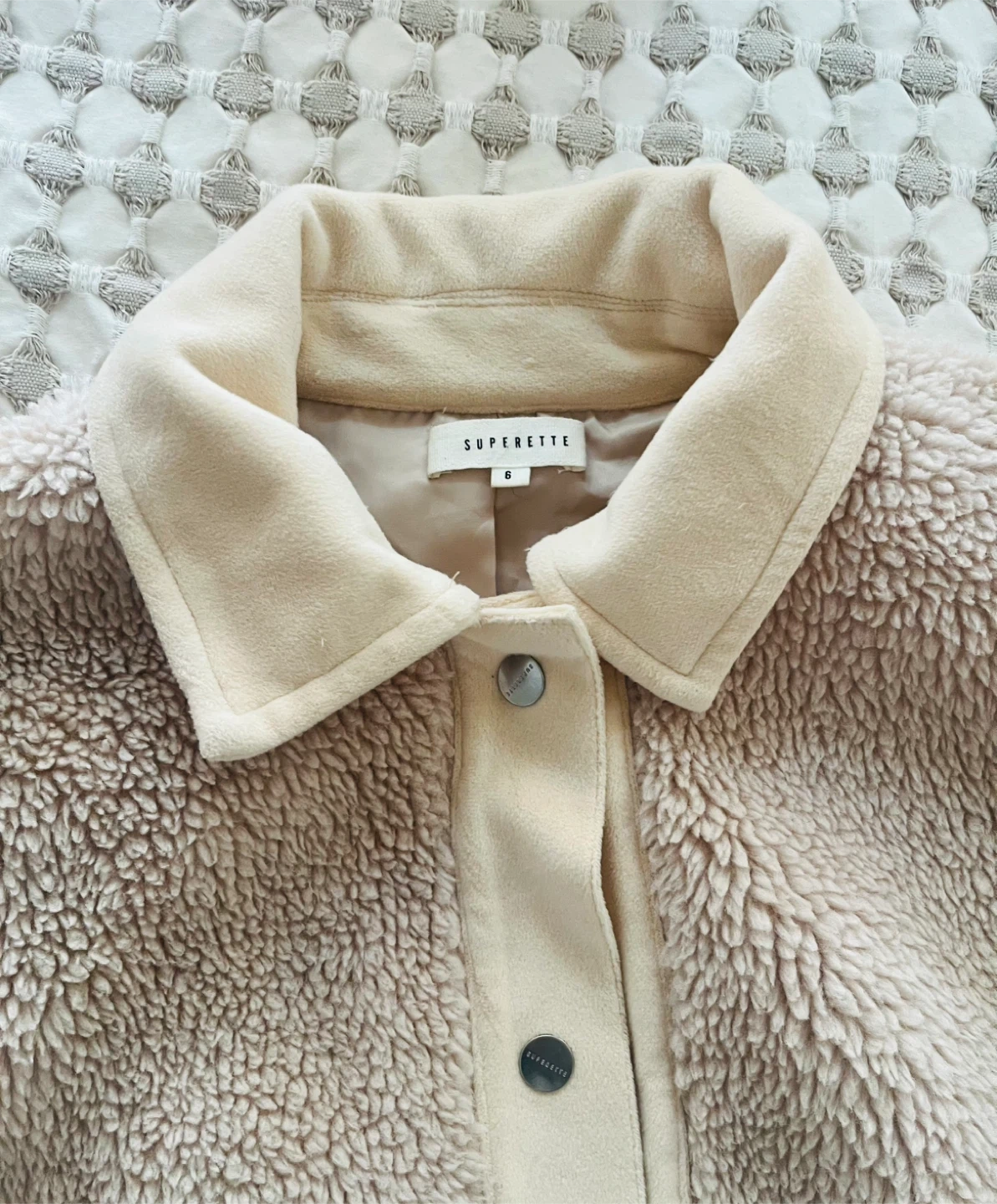 This SUPERETTE jacket features a cozy teddy fleece exterior with a contrasting collar and button placket. It's a size 6. A great layering piece for cooler weather!