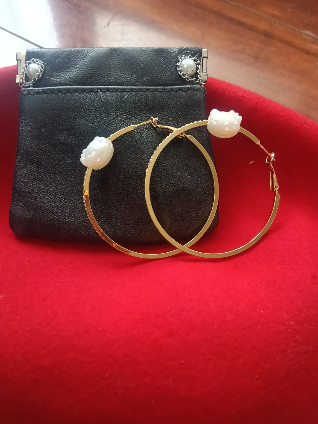The purse comes with a detachable chain (wear as crossbody or clutch), and includes hypoallergenic, gold-plated Hello Kitty hoop earrings that wonβt fade.