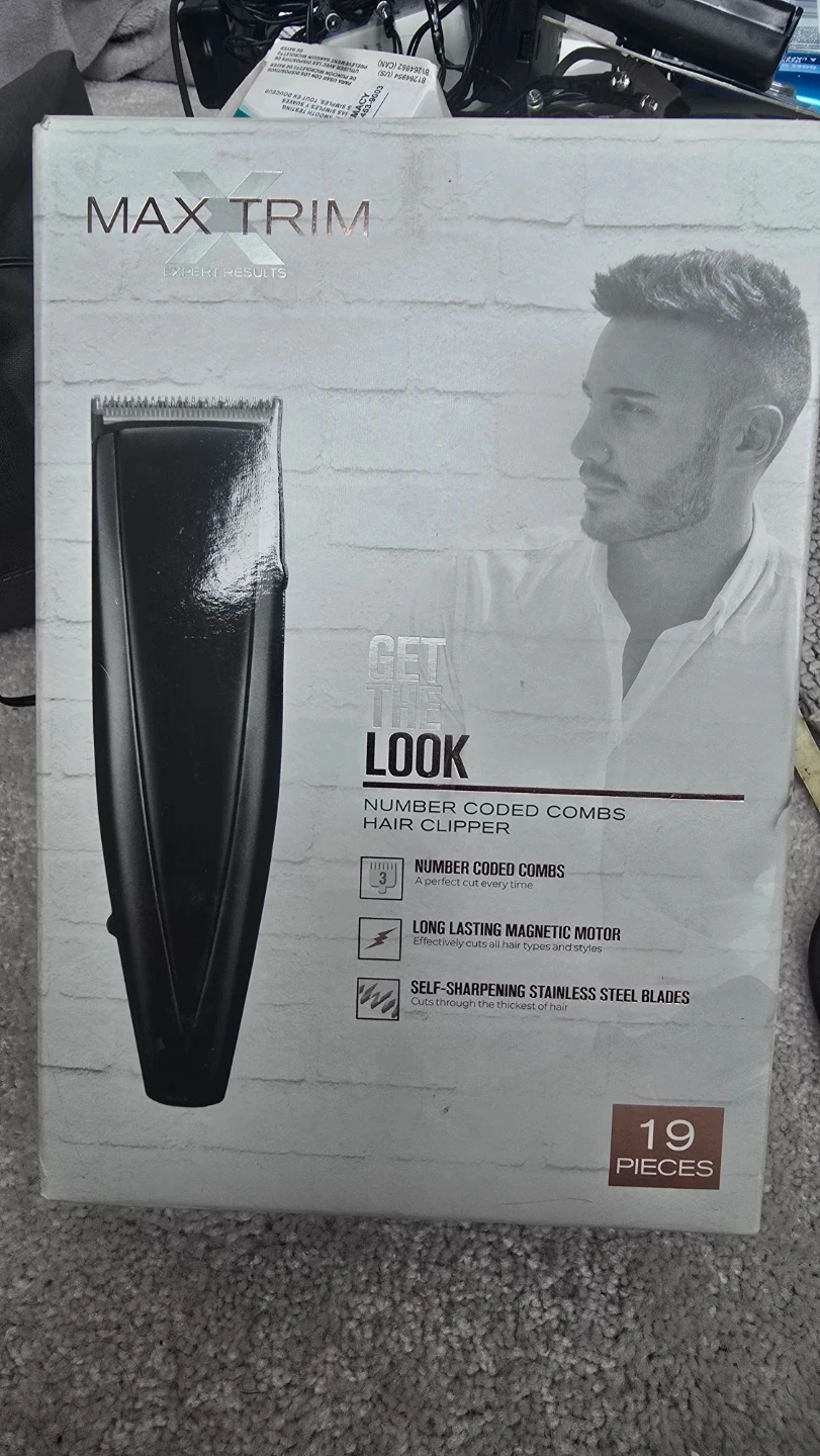 This MAX TRIM haircut kit comes with 19 pieces. It features a powerful magnetic motor and self-sharpening stainless steel blades. Includes 10 number coded guide combs for precise cuts.