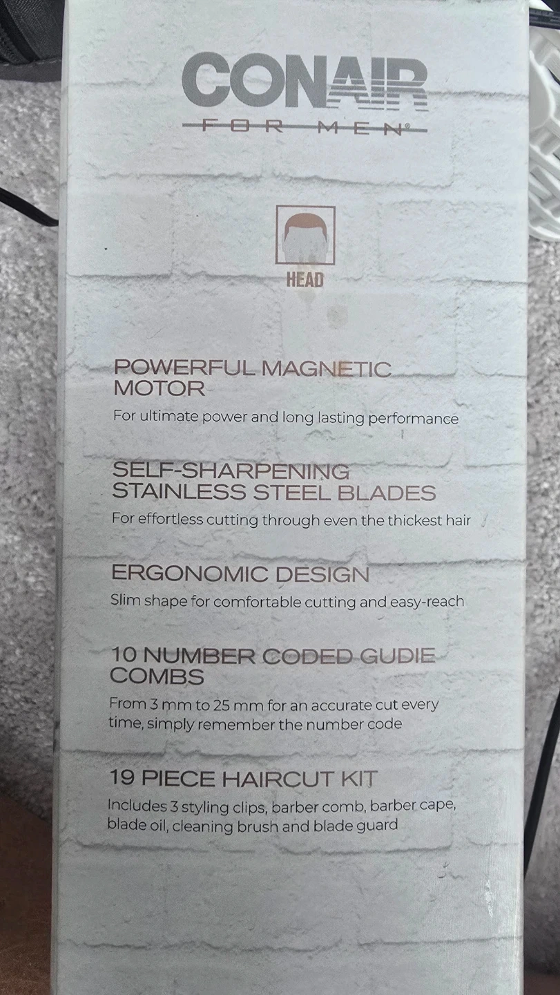 This MAX TRIM haircut kit comes with 19 pieces. It features a powerful magnetic motor and self-sharpening stainless steel blades. Includes 10 number coded guide combs for precise cuts.