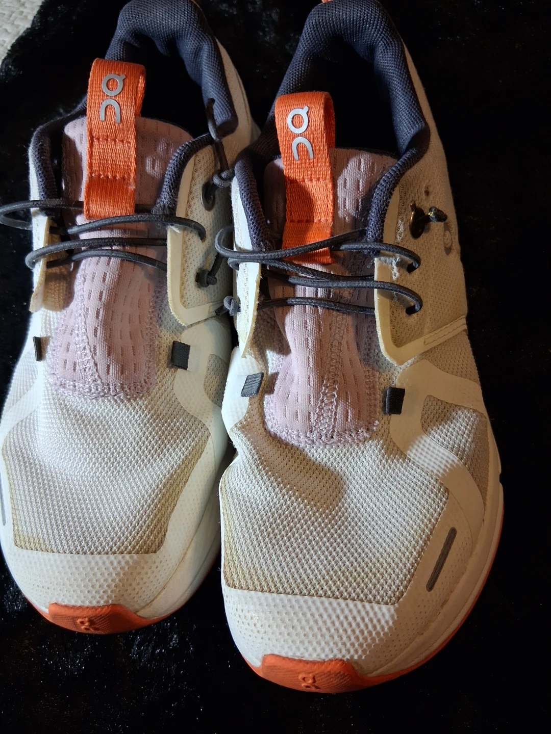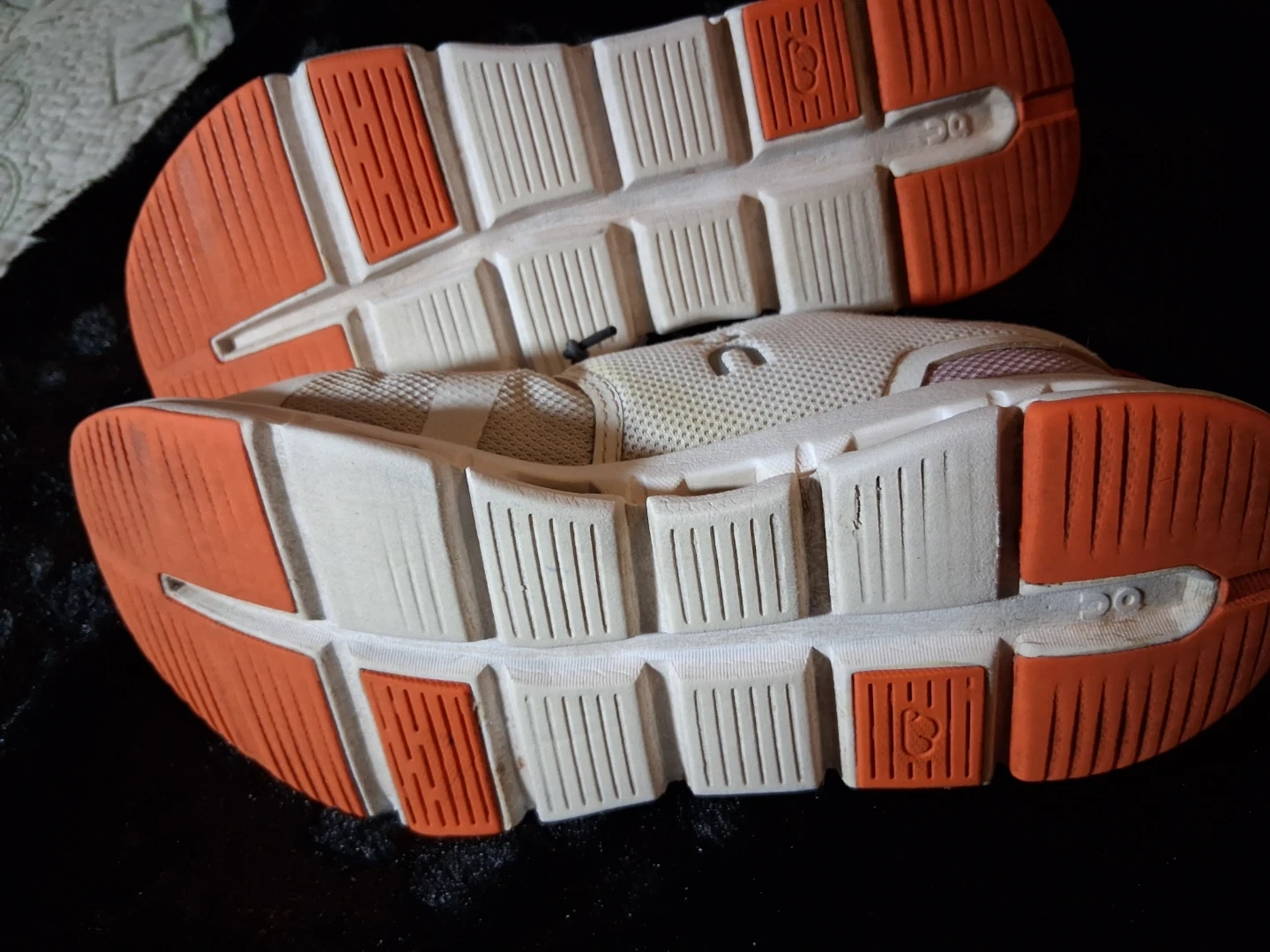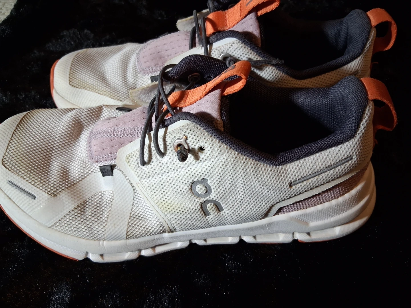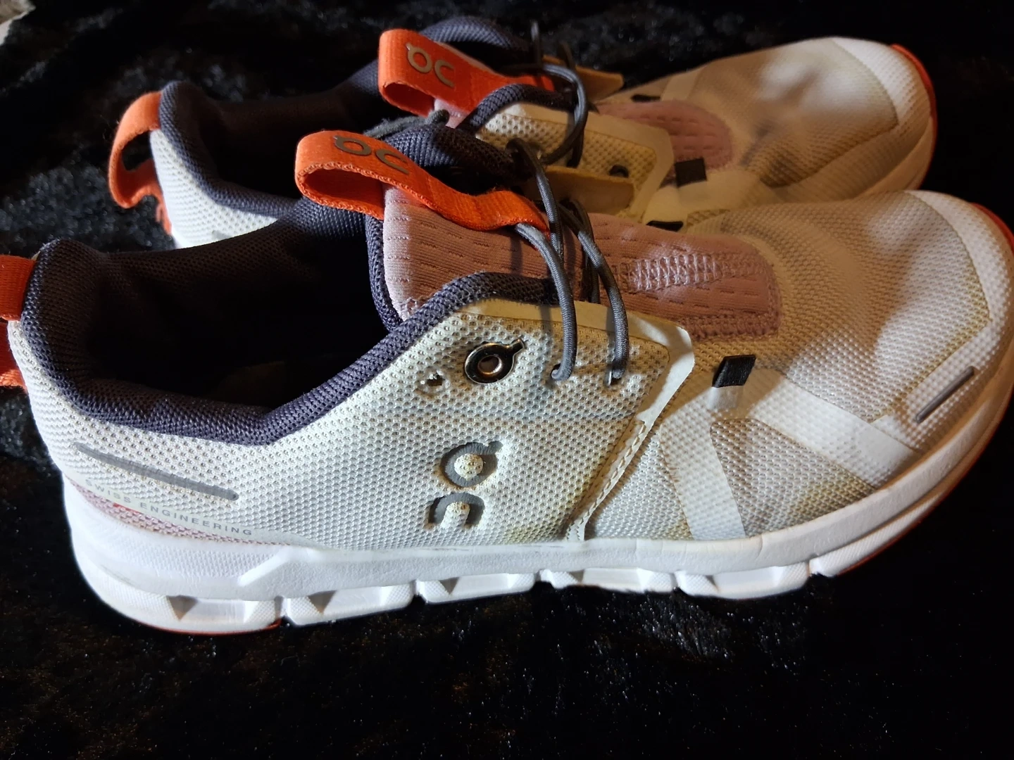 These ON Cloud running shoes are white with orange accents. They're designed for performance and comfort. Mesh upper and durable rubber sole.