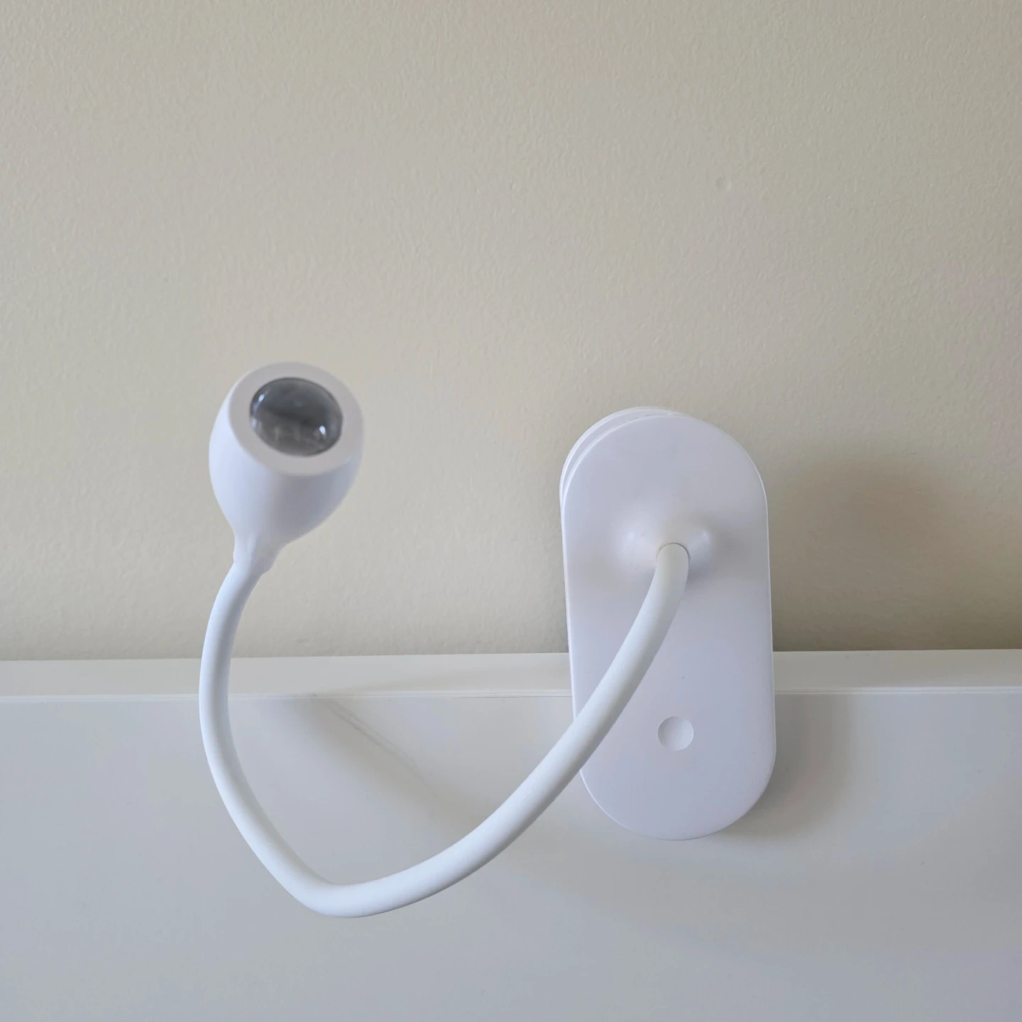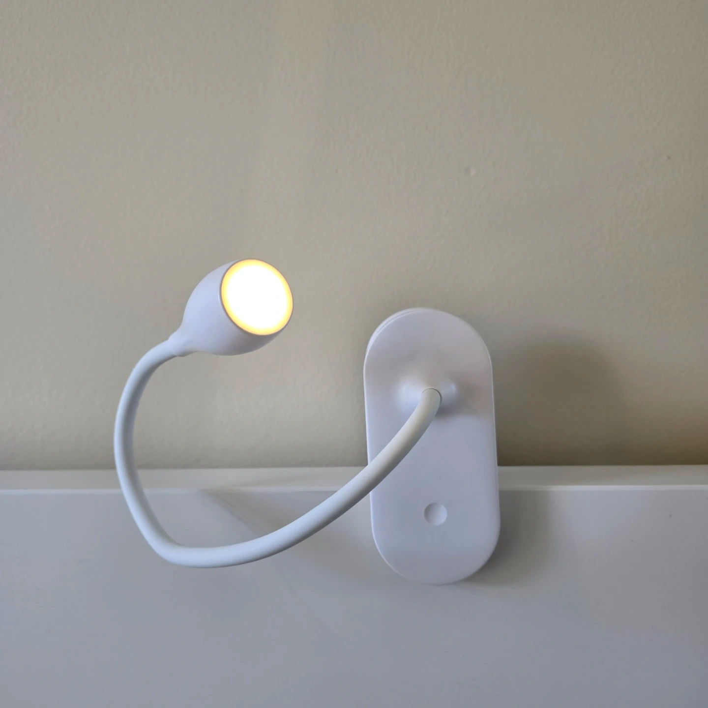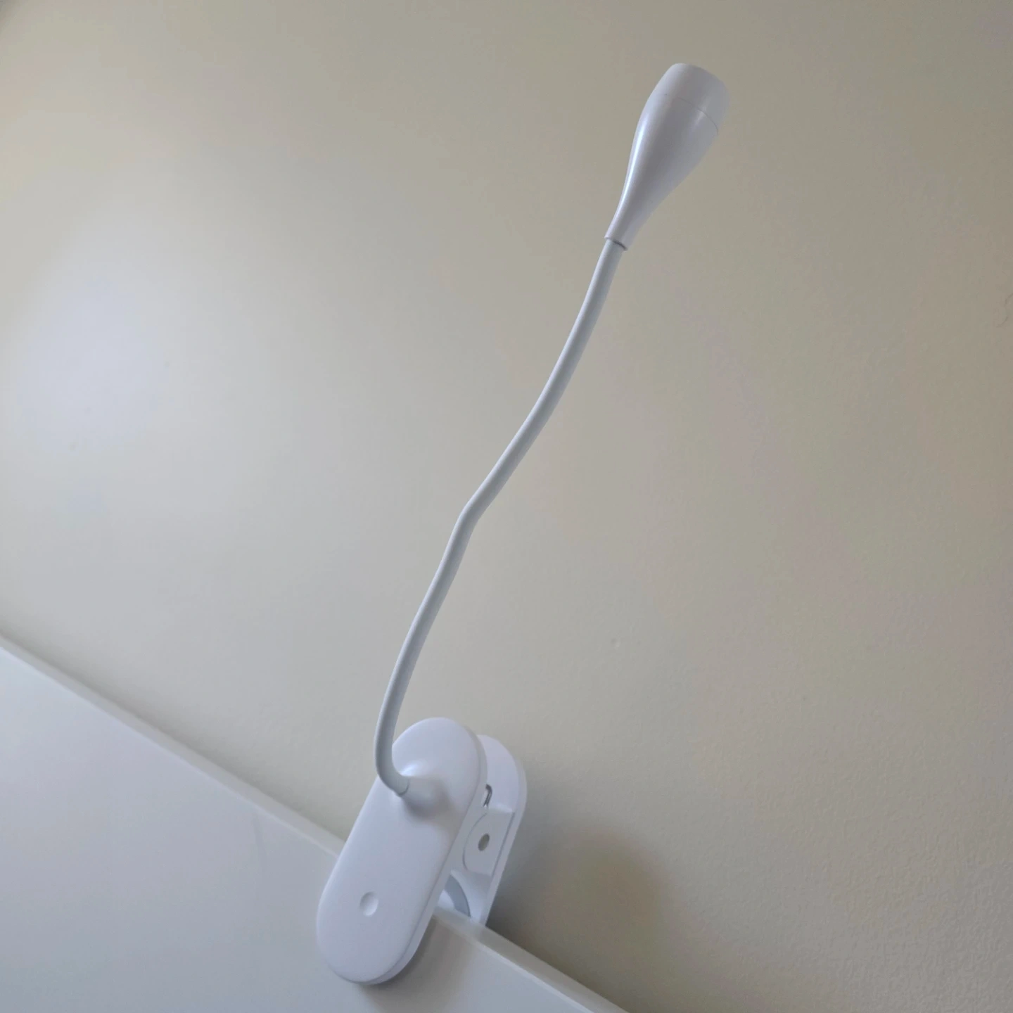 This is a white clip-on reading light. It features a flexible gooseneck for adjustable positioning. The clamp securely attaches to surfaces, making it handy for reading or tasks.