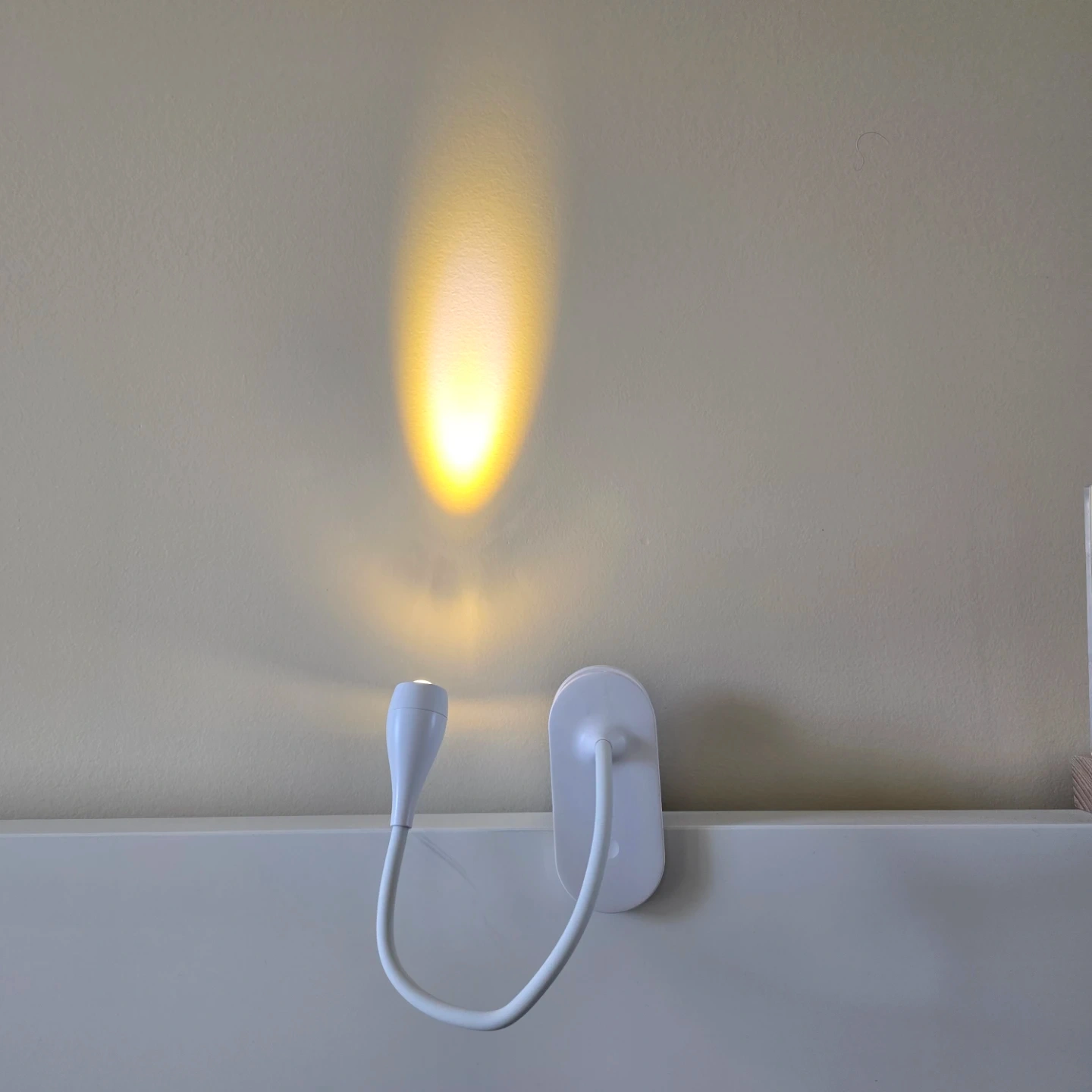 This is a white clip-on reading light. It features a flexible gooseneck for adjustable positioning. The clamp securely attaches to surfaces, making it handy for reading or tasks.