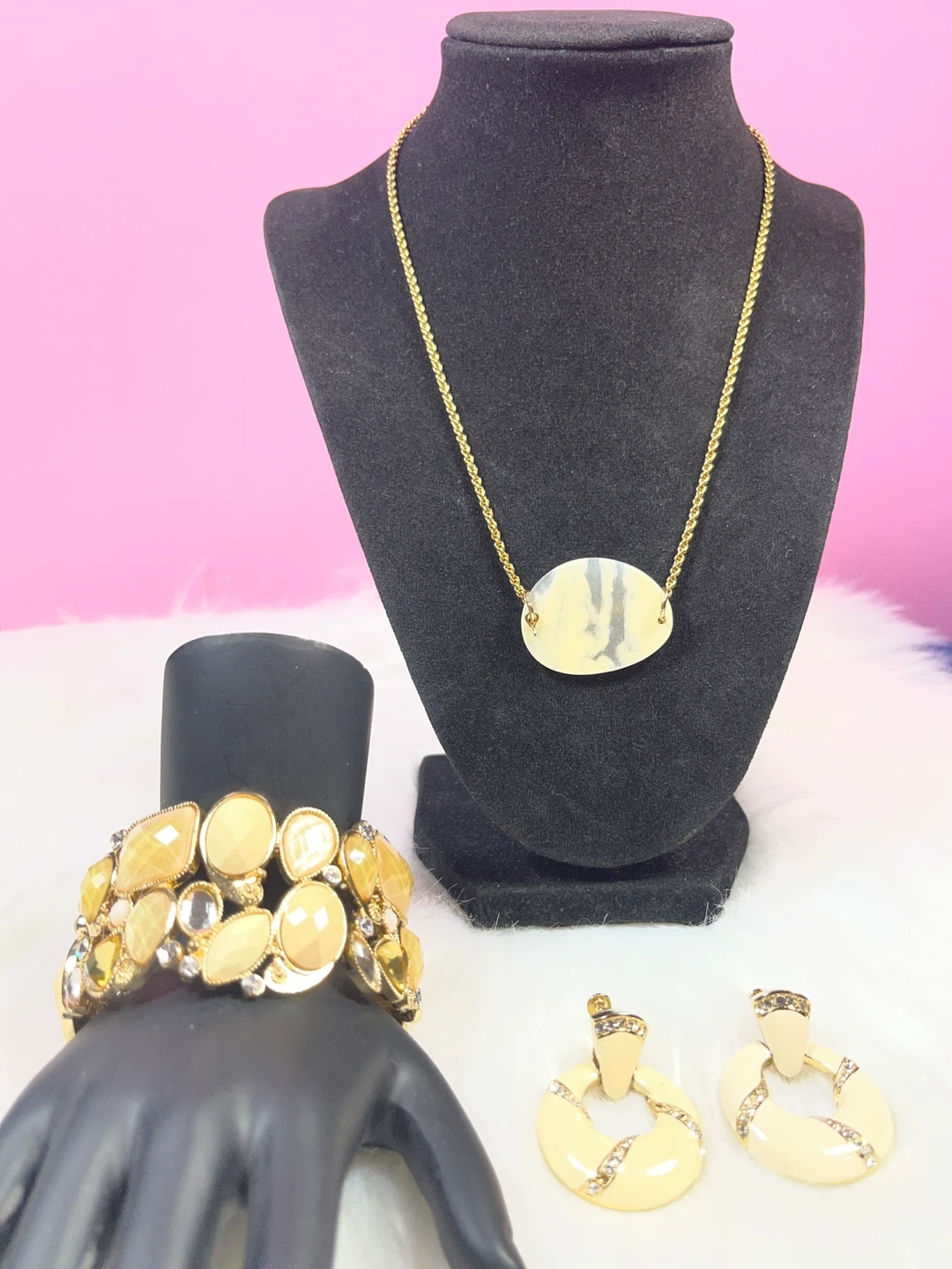 This used jewellery set includes a necklace, bracelet, and earrings, perfect for adding a touch of elegance to any outfit. The set features a beautiful combination of stones and gold-tone metal. It appears to be in good condition . The necklace is Avon ! If the ad is still up, it's available!
