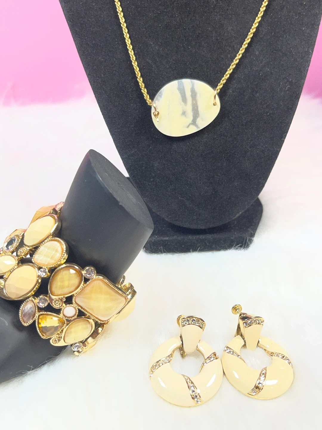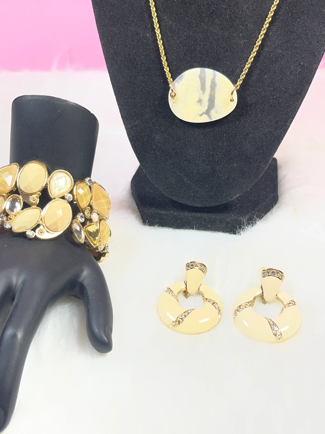 This used jewellery set includes a necklace, bracelet, and earrings, perfect for adding a touch of elegance to any outfit. The set features a beautiful combination of stones and gold-tone metal. It appears to be in good condition . The necklace is Avon ! If the ad is still up, it's available!