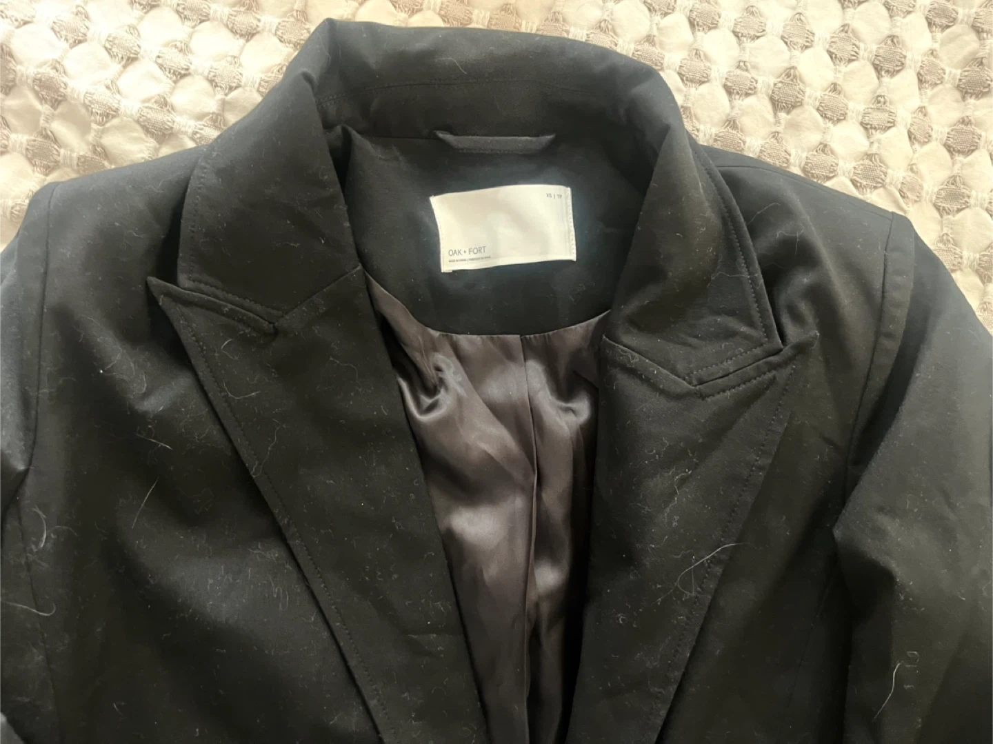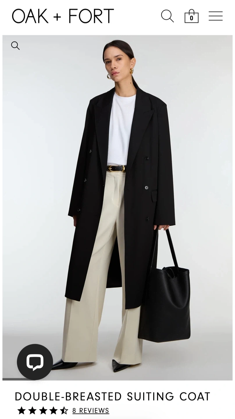 This is an OAK+FORT black double-breasted long suiting coat. It features a satin lining and button cuffs. It's a classic piece for any wardrobe!