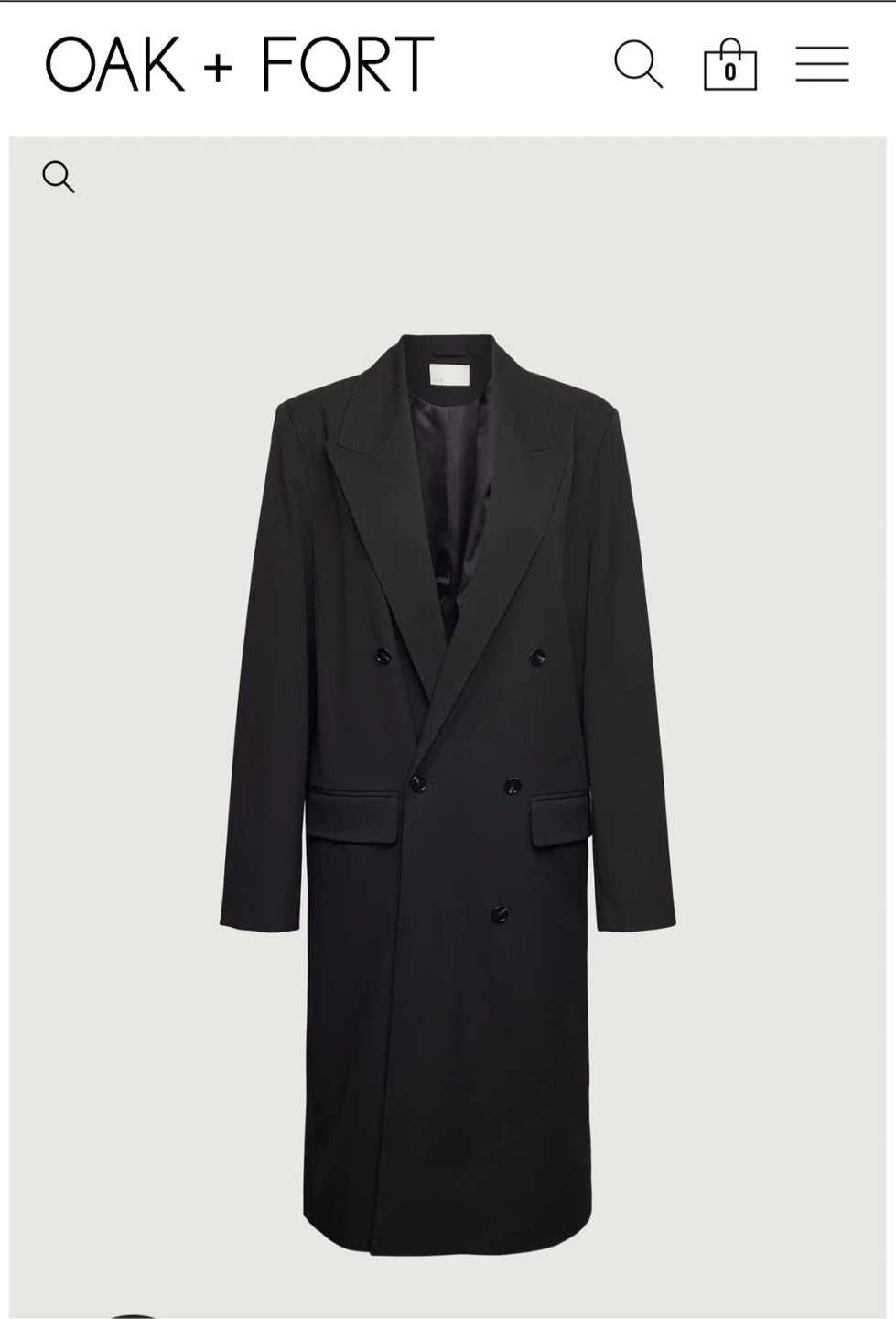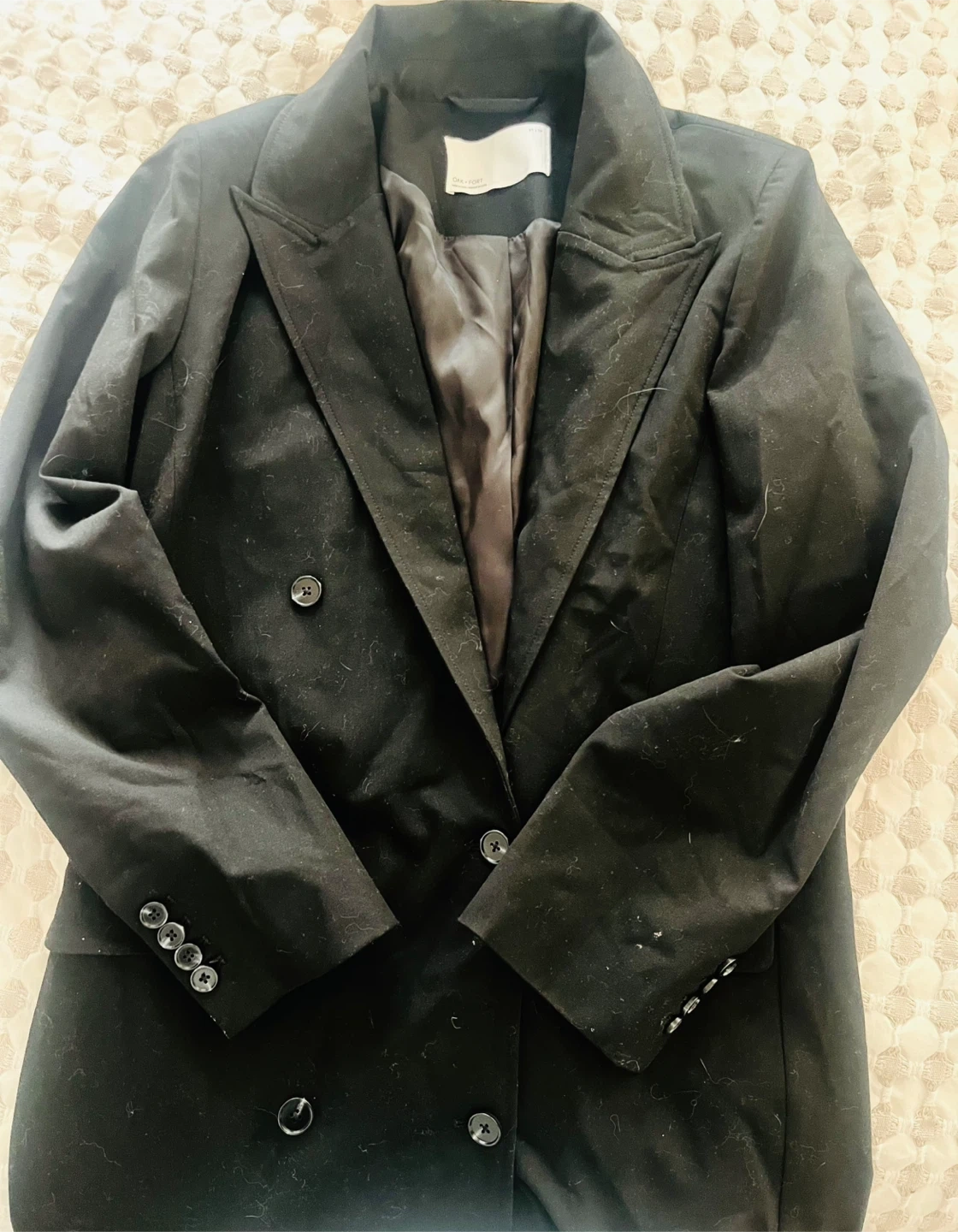 This is an OAK+FORT black double-breasted long suiting coat. It features a satin lining and button cuffs. It's a classic piece for any wardrobe!