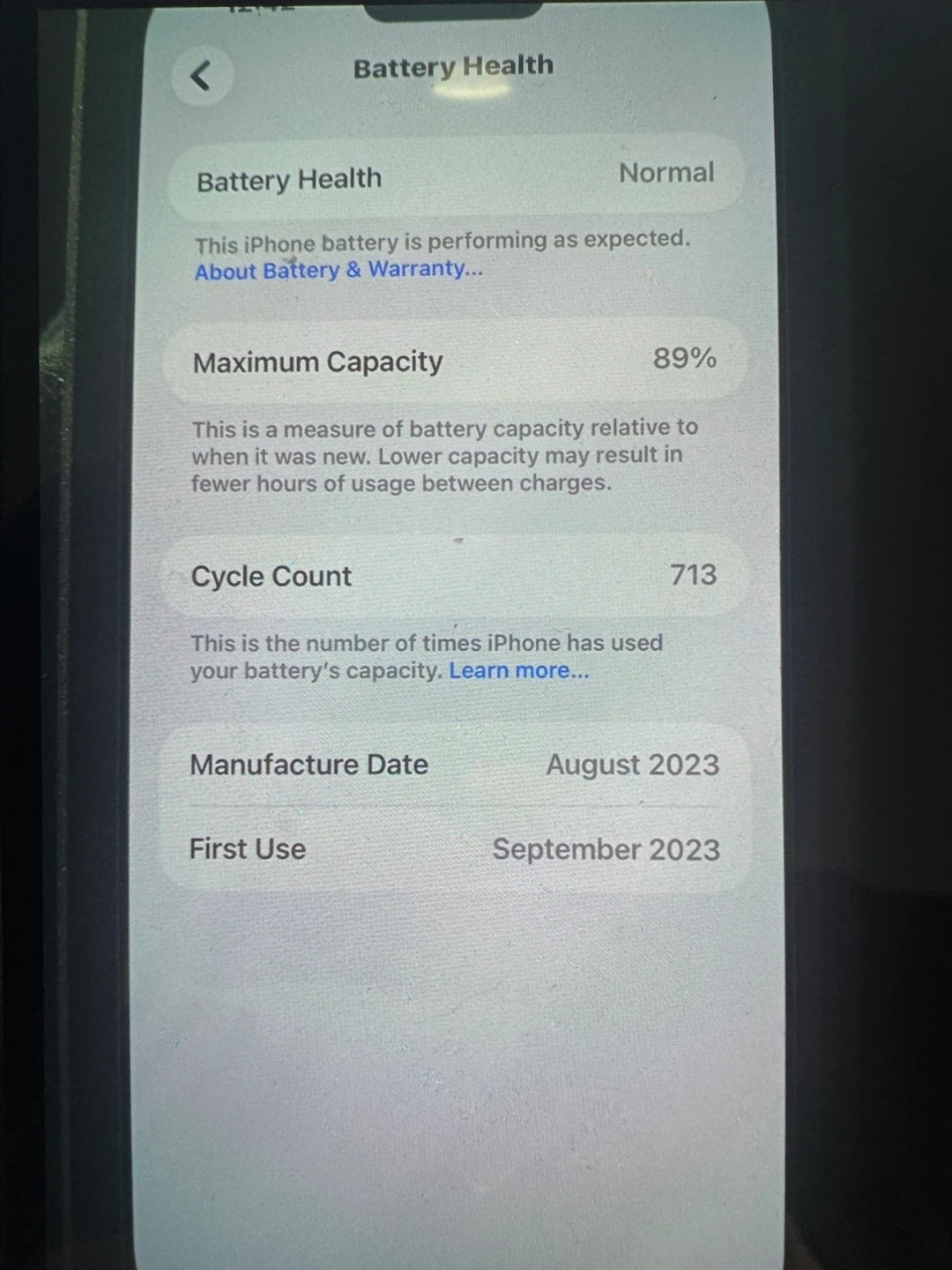 Apple iPhone 15 Pro Max, graphite colour. Battery maximum capacity is 89% with a cycle count of 713. Storage is 256GB. Selling it cause I need money send your best offer