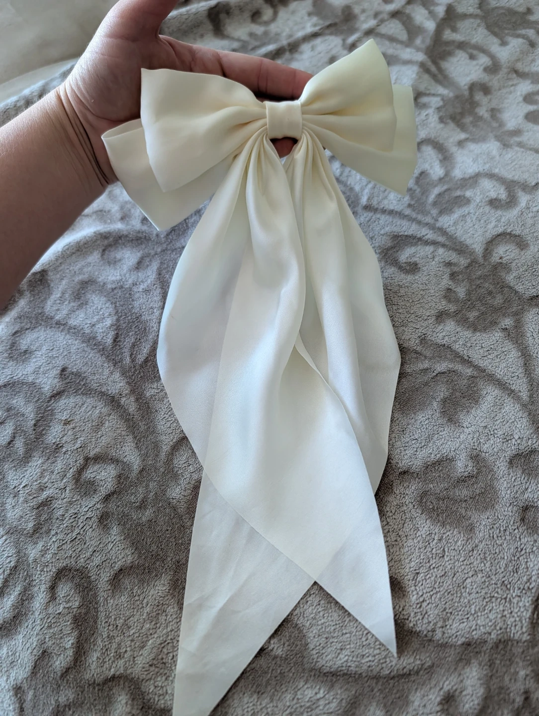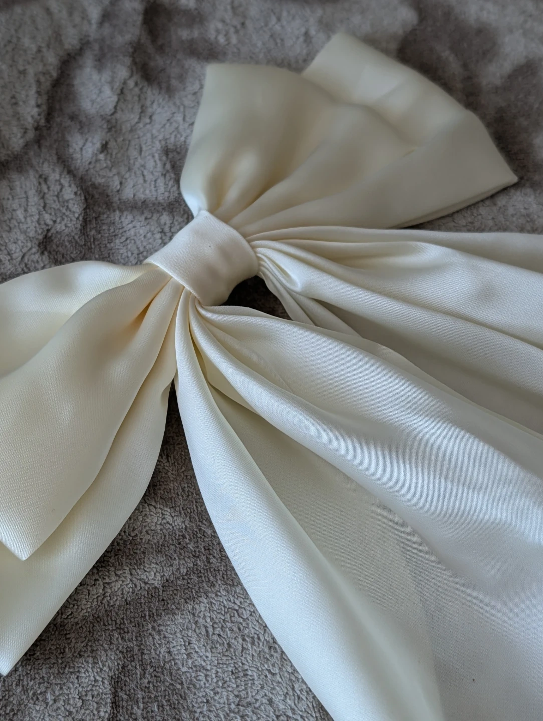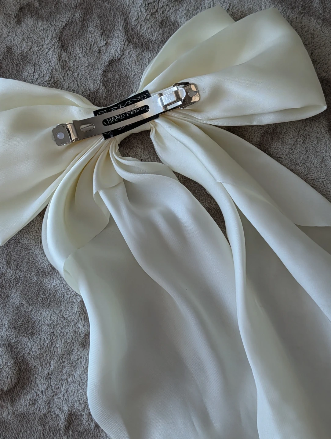 Oversized cream bow hair clip with a satin finish. It's handmade and features a secure metal clip. This statement accessory adds a touch of elegance to any hairstyle!