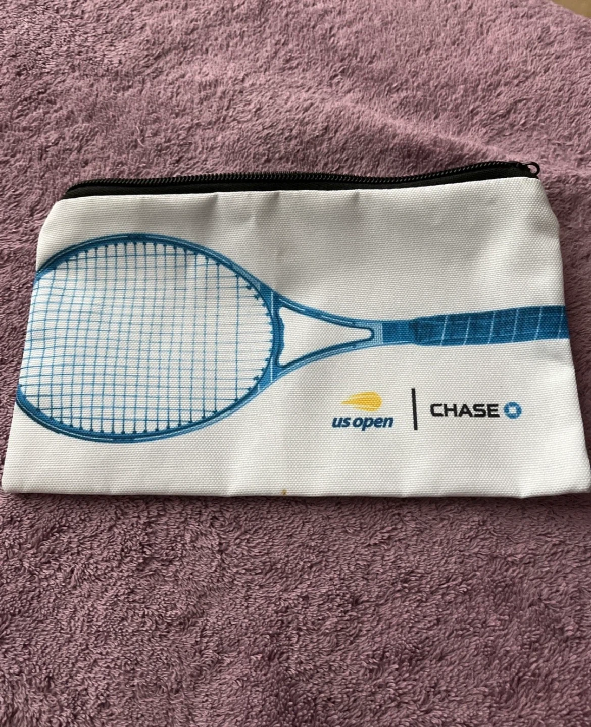 This zippered pouch features a US Open tennis graphic. It's white with a blue tennis racket design. The back is plain white.