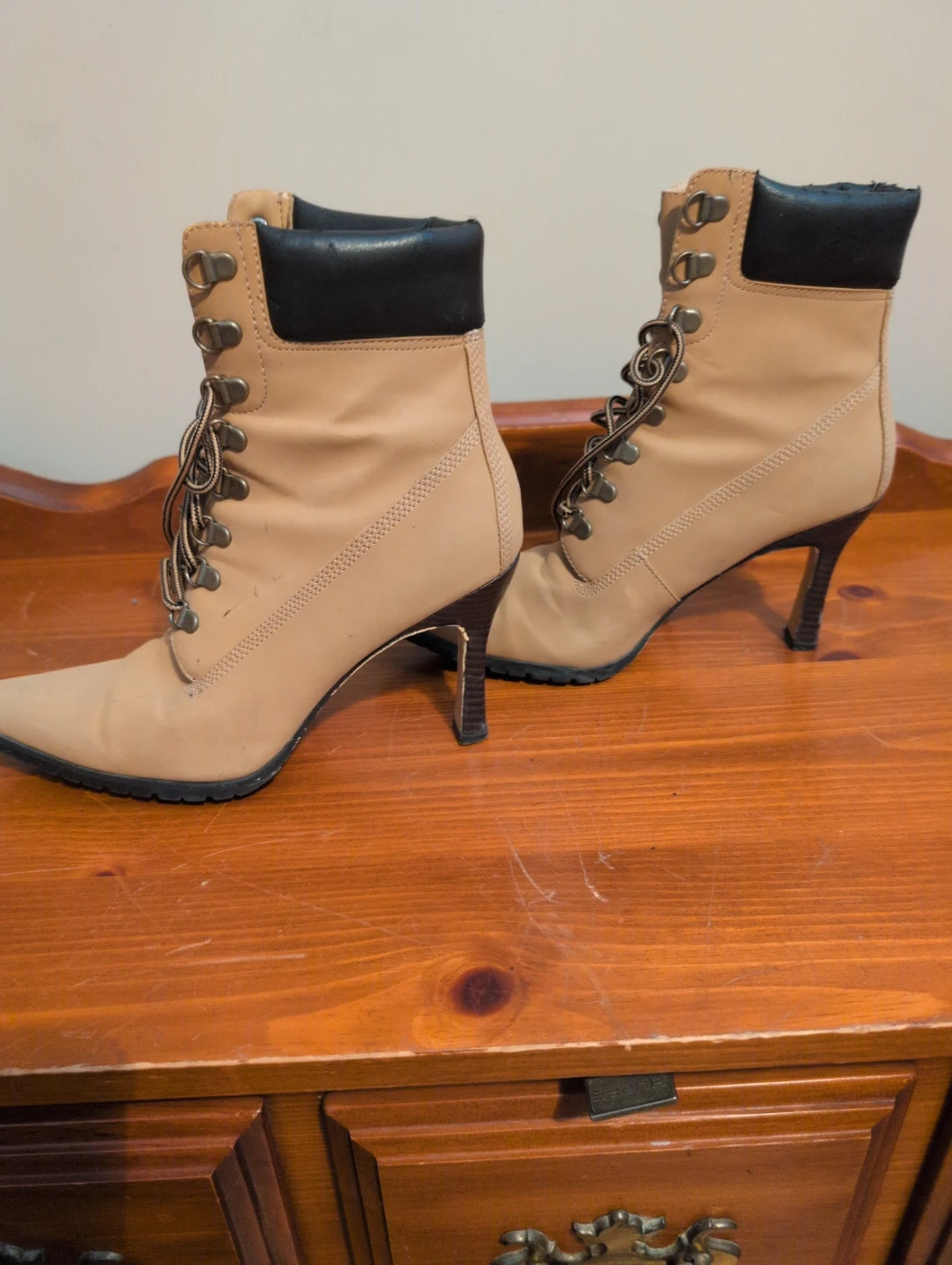 These stylish tan boots feature a lace-up front with metal eyelets and black trim. They have a pointed toe and a stacked heel. Suitable for dressy or casual occasions.