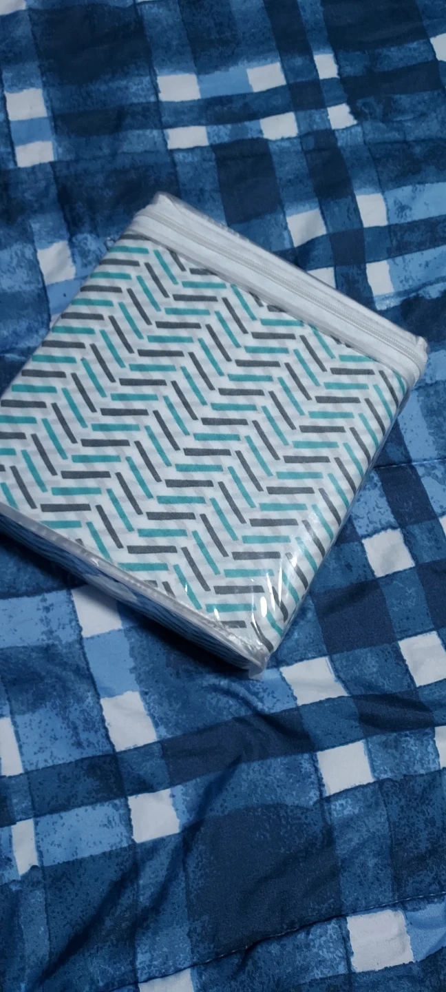 This zippered pillowcase features a modern chevron pattern in teal, gray, and white. It's made from a durable fabric and zips closed for easy insertion and removal. Great for protecting your pillows or adding a decorative touch! TWIN size