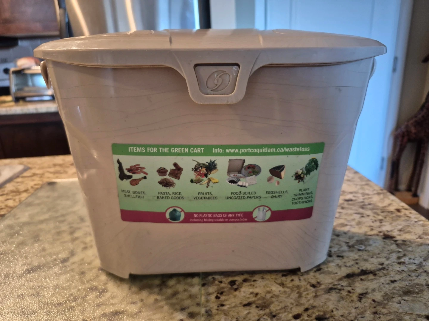This green bin is designed for kitchen use. It comes with a lid. This bin is perfect for collecting food scraps. Item has no handle. User should add on by string or a rope.
