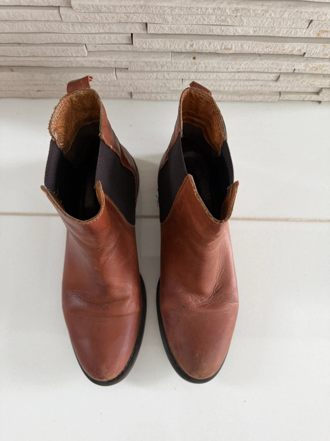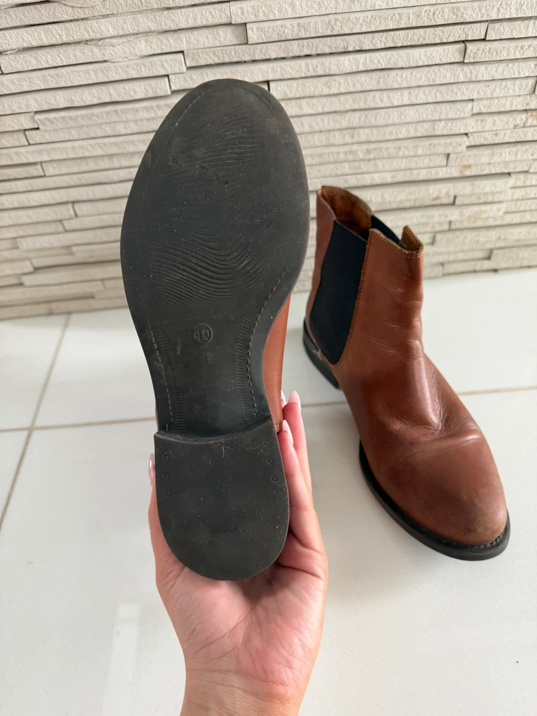 These are a pair of brown leather Chelsea boots. They feature elastic side panels for easy on and off. Size is 40.