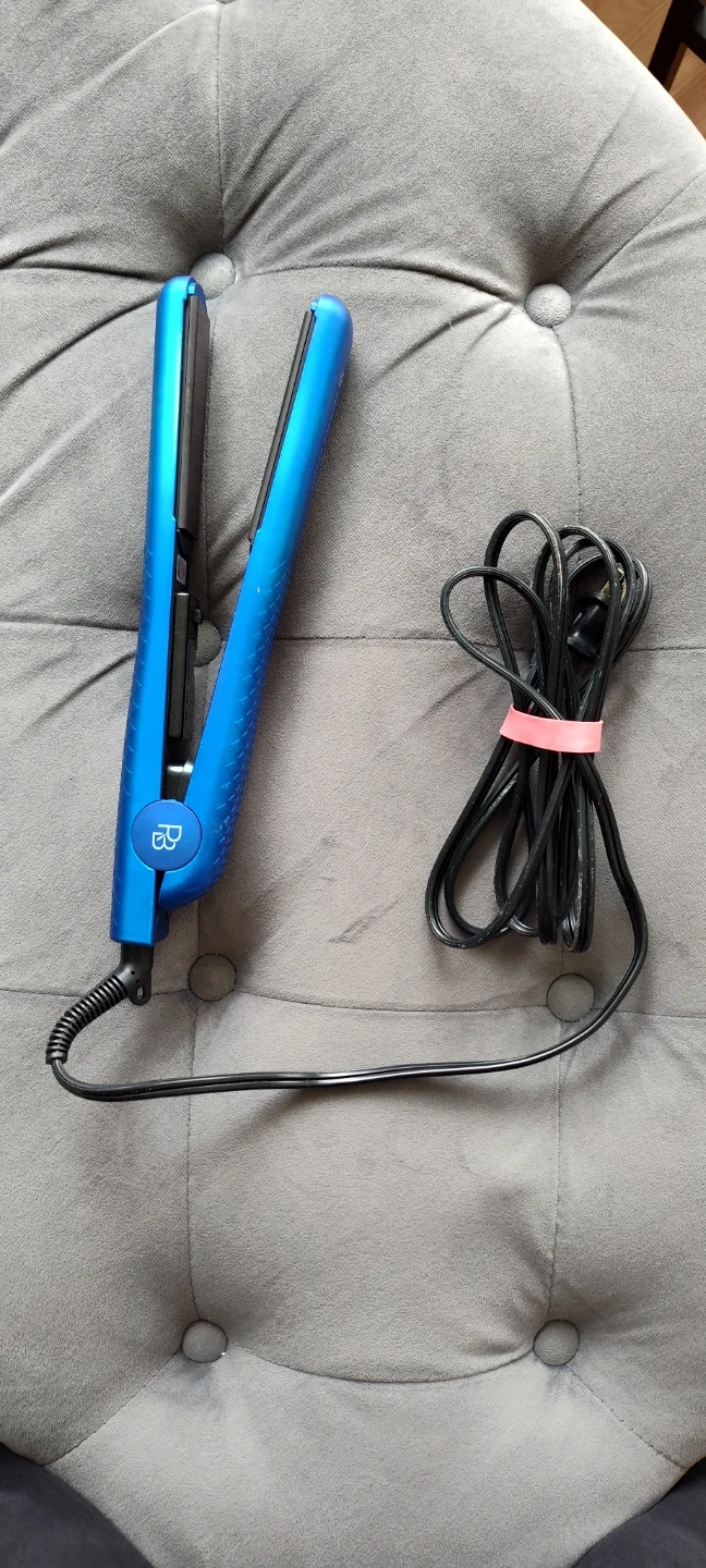 This is a blue hair straightener by Relaxus Beauty. It has ceramic plates and an adjustable temperature setting. It's a handy tool for achieving smooth, straight hair quickly.