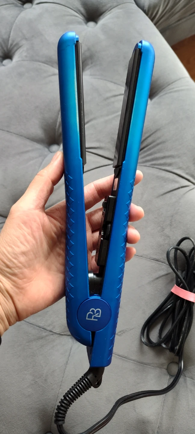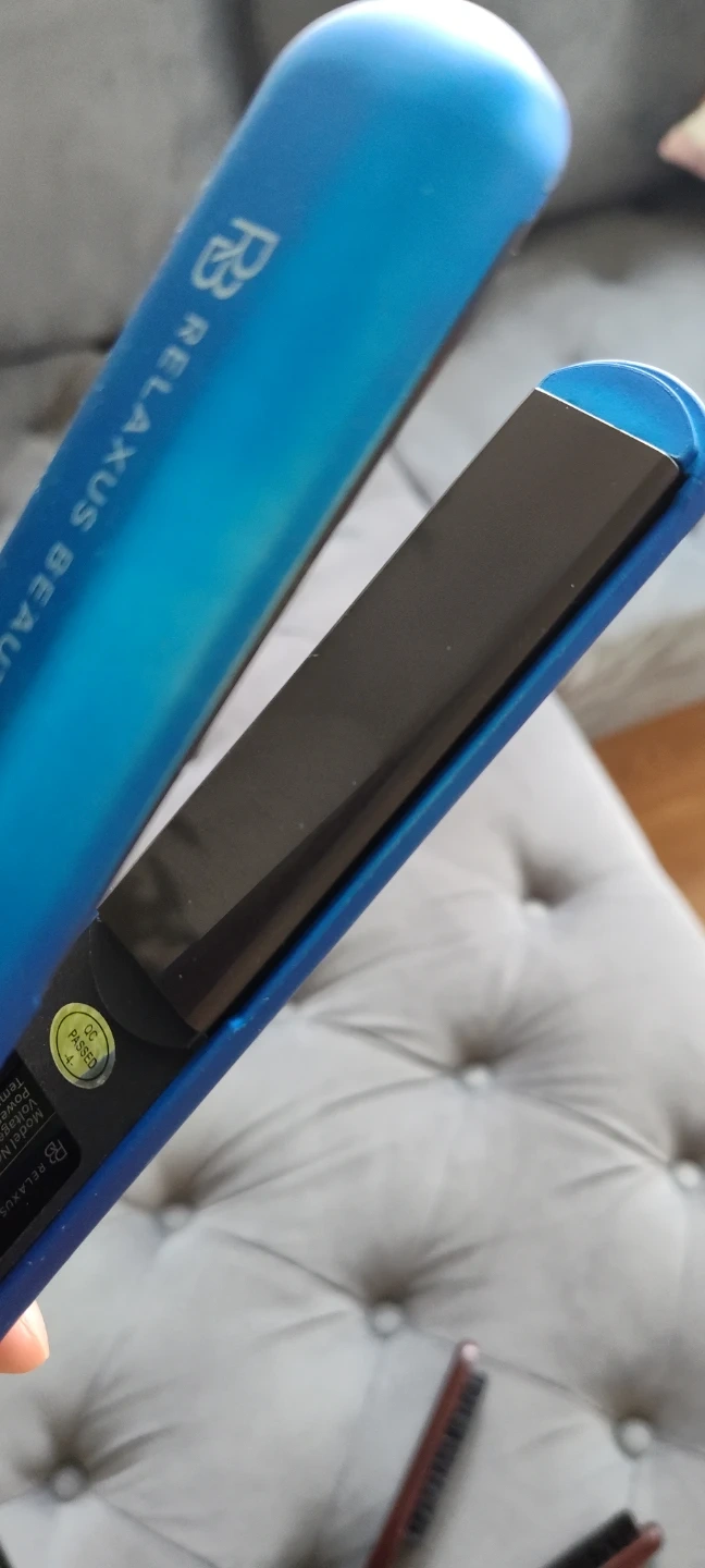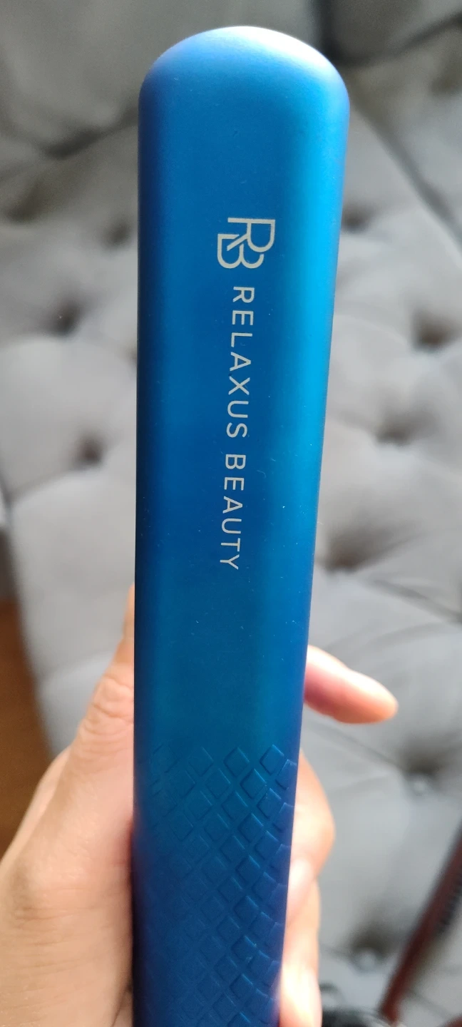 This is a blue hair straightener by Relaxus Beauty. It has ceramic plates and an adjustable temperature setting. It's a handy tool for achieving smooth, straight hair quickly.