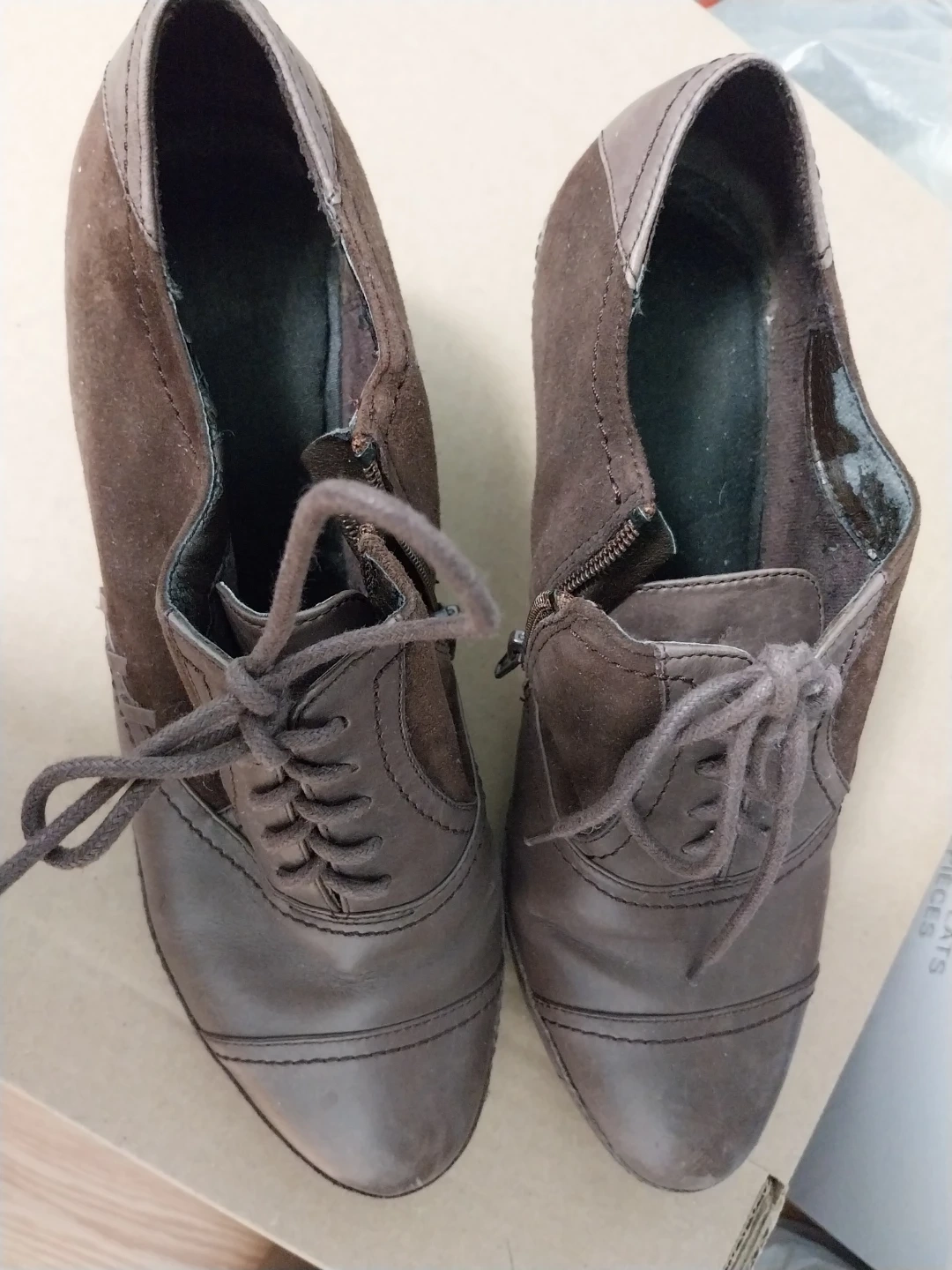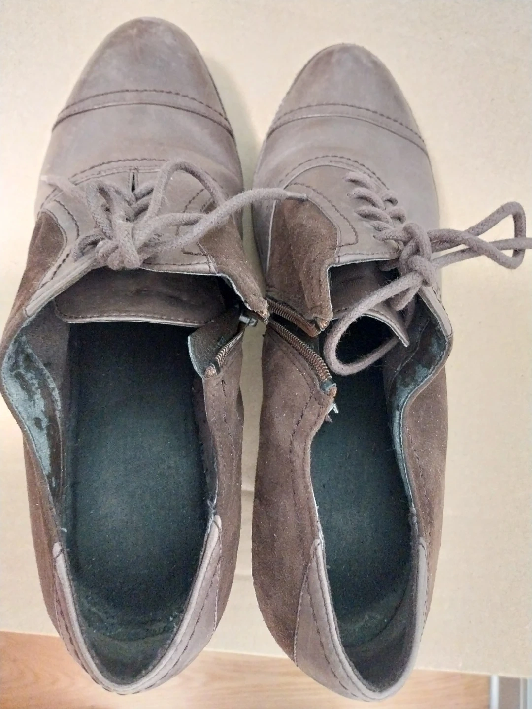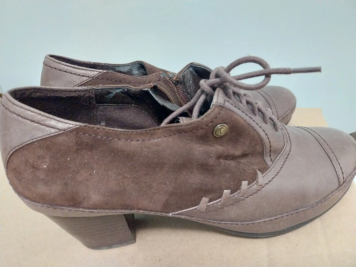 These stylish brown shoes combine smooth leather with soft suede accents. They feature a classic lace-up front and a convenient side zipper. The stacked 2.5 inch heel offers a bit of height and a polished look.