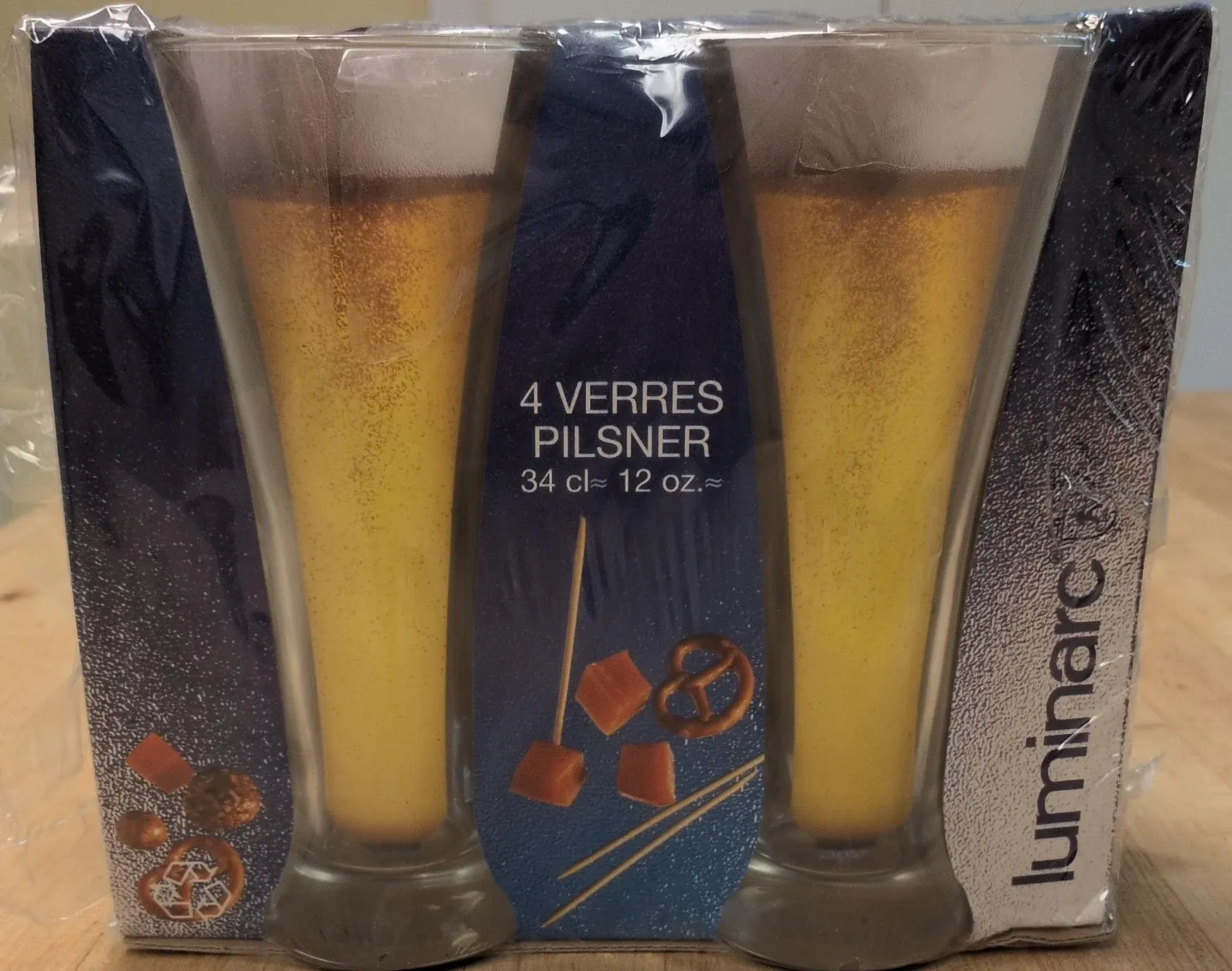 This is a set of 4 Luminarc Pilsner glasses. Each glass holds 34 cl or approximately 12 oz. Perfect for enjoying your favourite beer!