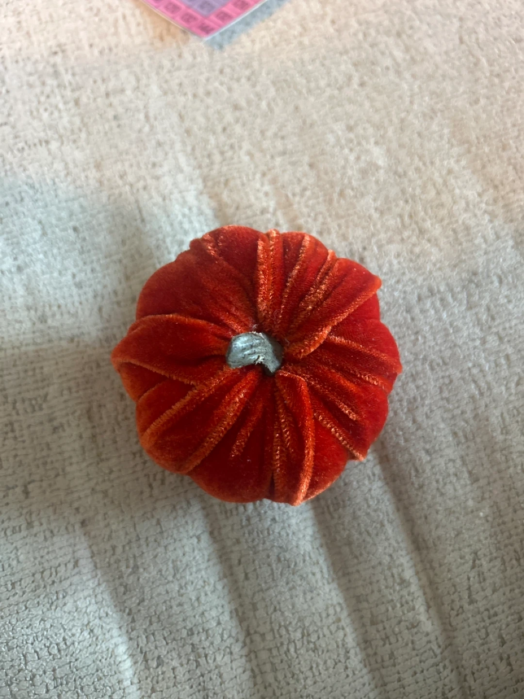 A small, burnt orange velvet pumpkin decoration with a silver stem. It's perfect for adding a touch of autumn to any space. Great for crafts or small displays!